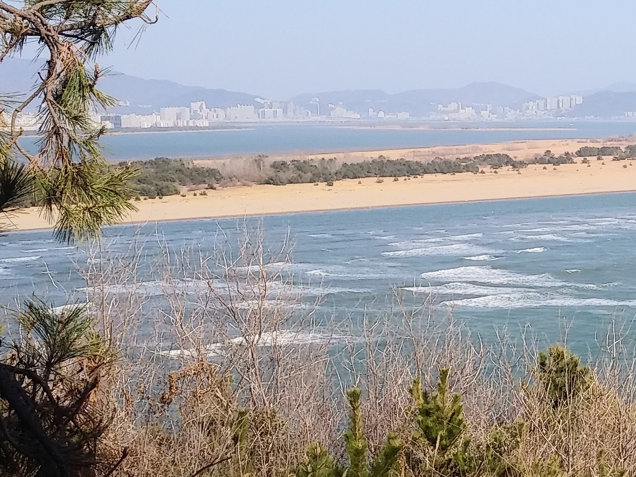 국수봉을 오르다가 뒤를 돌아본다. 진우도가 바로 건너편에 보인다. 진우도는 1905년경부터 (당시는 낙동강 주류였던) 서낙동강 하구에 토사가 퇴적되기 시작하여 1955년에는 지적등록까지 이루어진 섬이다. 국가지정문화재 낙동강 하구 철새 보호구역으로 지정되어 있다. 이 해안사구에 진우원이라는 고아원이 있었는데 1959년 추석 아침에 몰아친 사라호 태풍으로 큰 피해를 입고 철수하였다. 그 이름을 따서 진우도라 불린다.