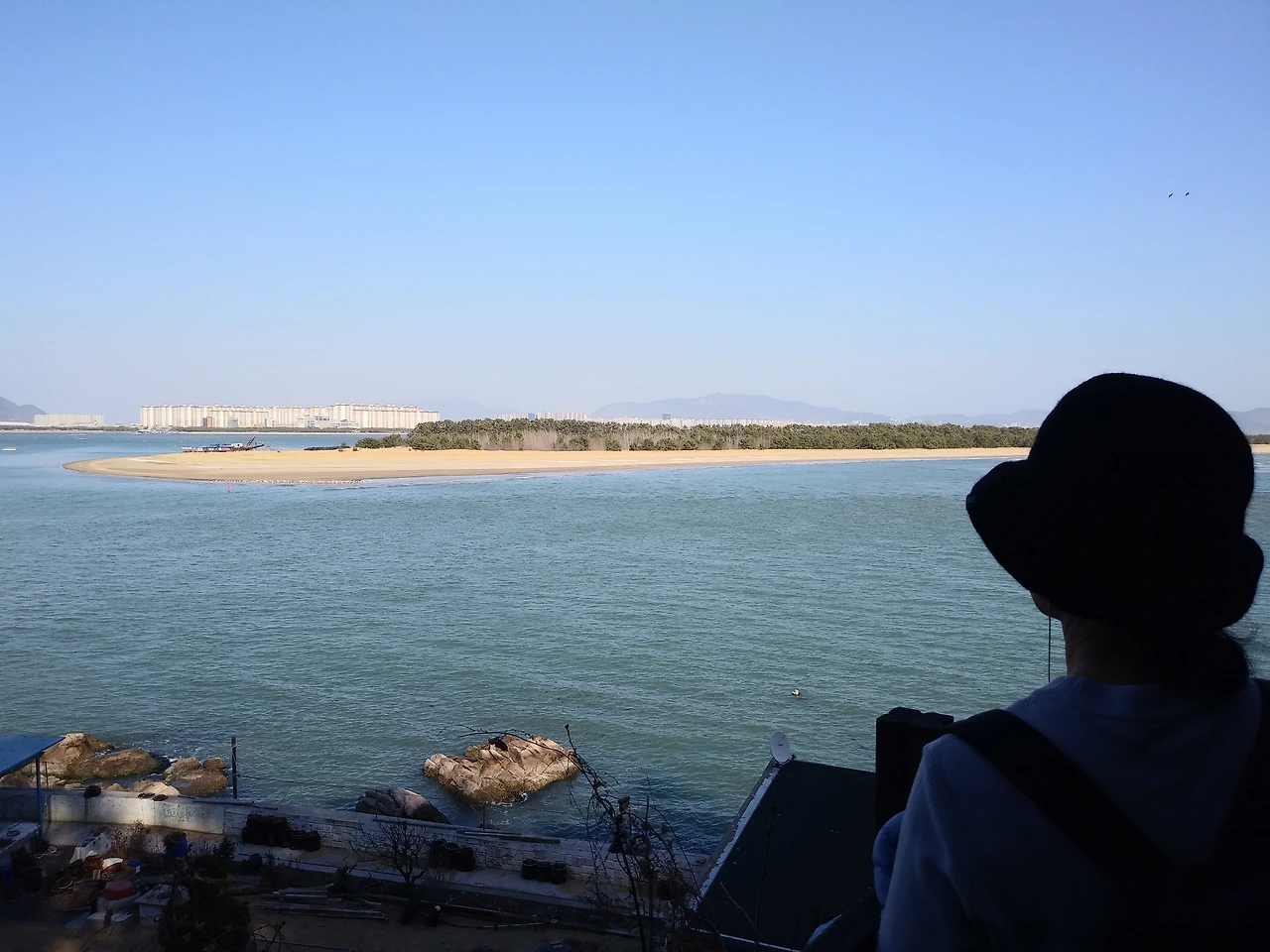 내려가는 길에서 바라보는 눌차만의 경치가 아름다워 '찰칵'하며 셔터를 누른다. 눌차만 건너편에 가덕도의 중심지인 동선동과 성북동이 보이고, 중앙에 죽도가 동그랗게 떠있다.