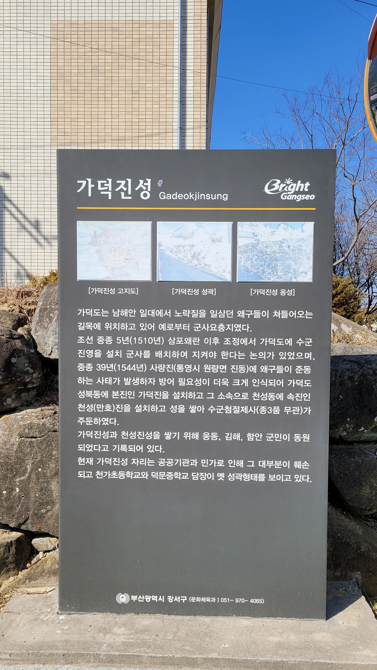 갈맷길 리본을 길잡이로 골목골목을 느리게 걸어 연대봉 가는 길을 따라가다가 덕문중학교 담장 앞에 세워진 '가덕진성' 안내판 앞에 선다. 성곽은 대부분 훼손되고 안내판이 서 있는 덕문중학교와 천가초등학교 남쪽 담장이 옛 성곽의 형태를 보이고 있다.