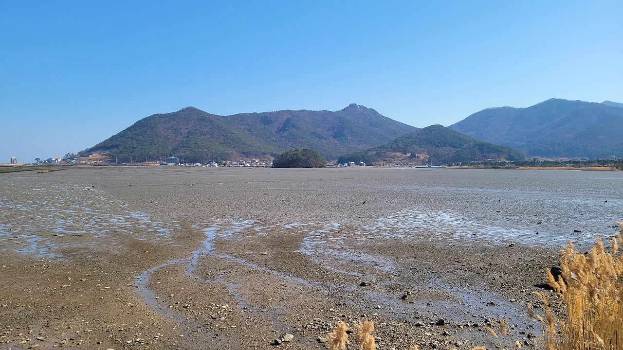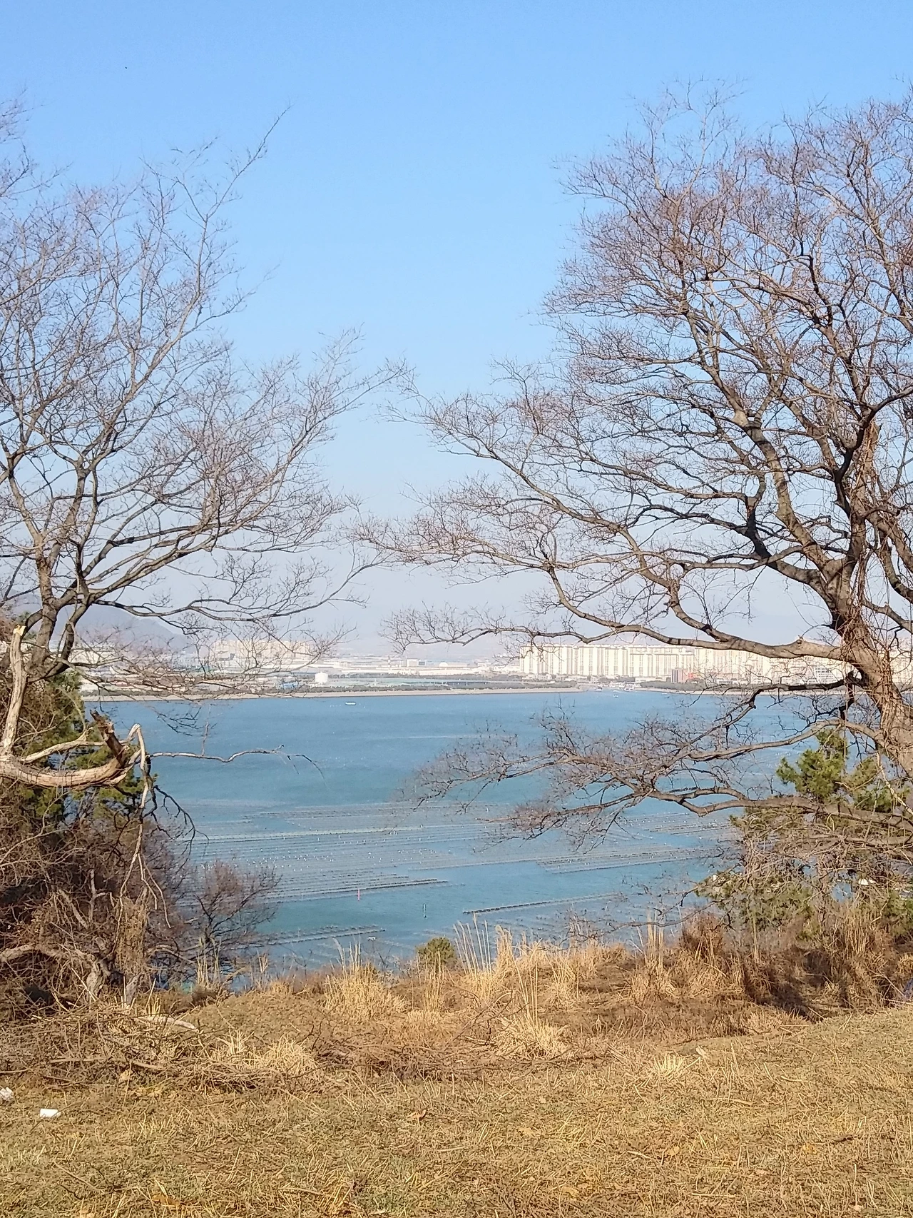 정거마을의 앞바다를 바라본다. 좌우의 잎이 떨어진 나뭇가지와 짙은 푸른색 바다, 약간 옅은 푸른색 하늘, 누른 빛의 마른 풀이 한 폭의 그림이다.