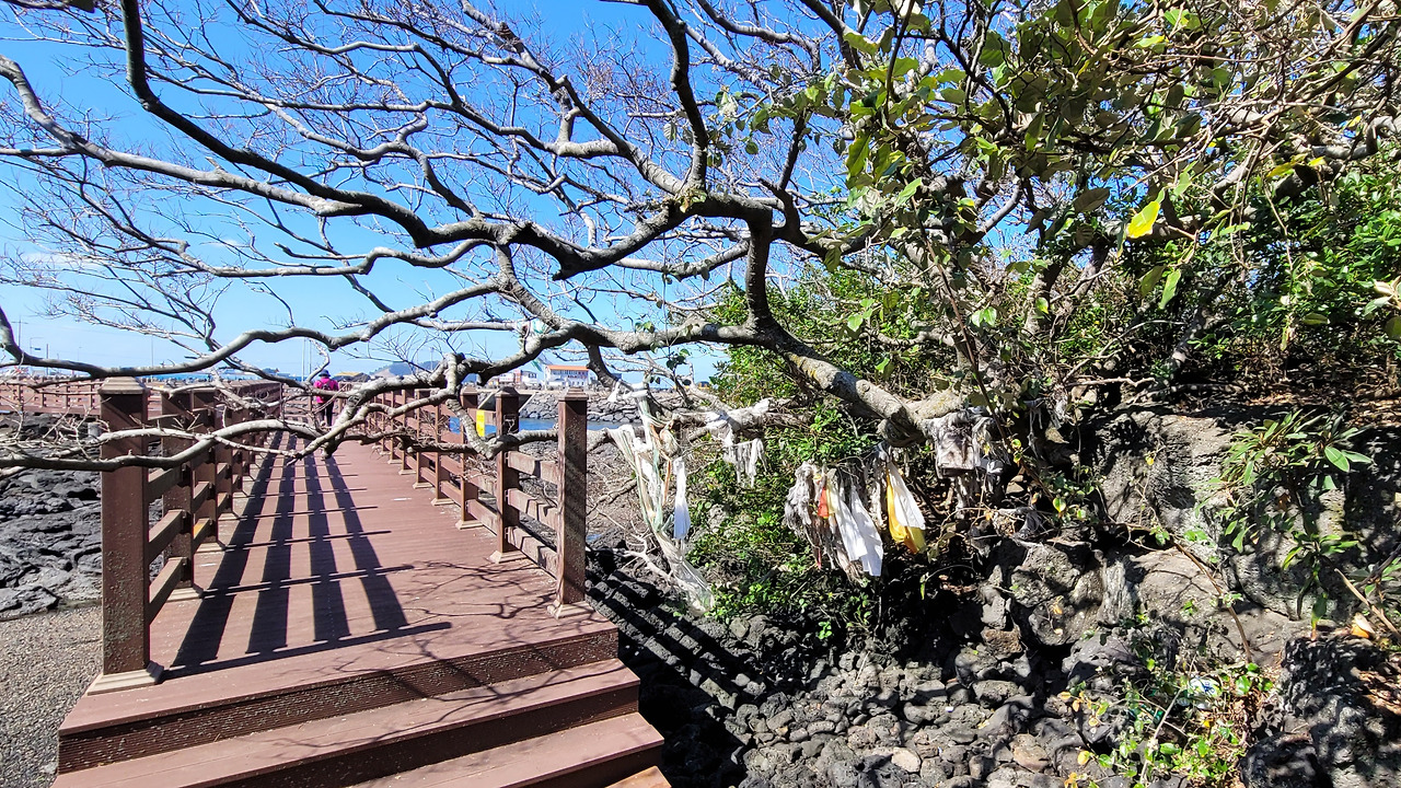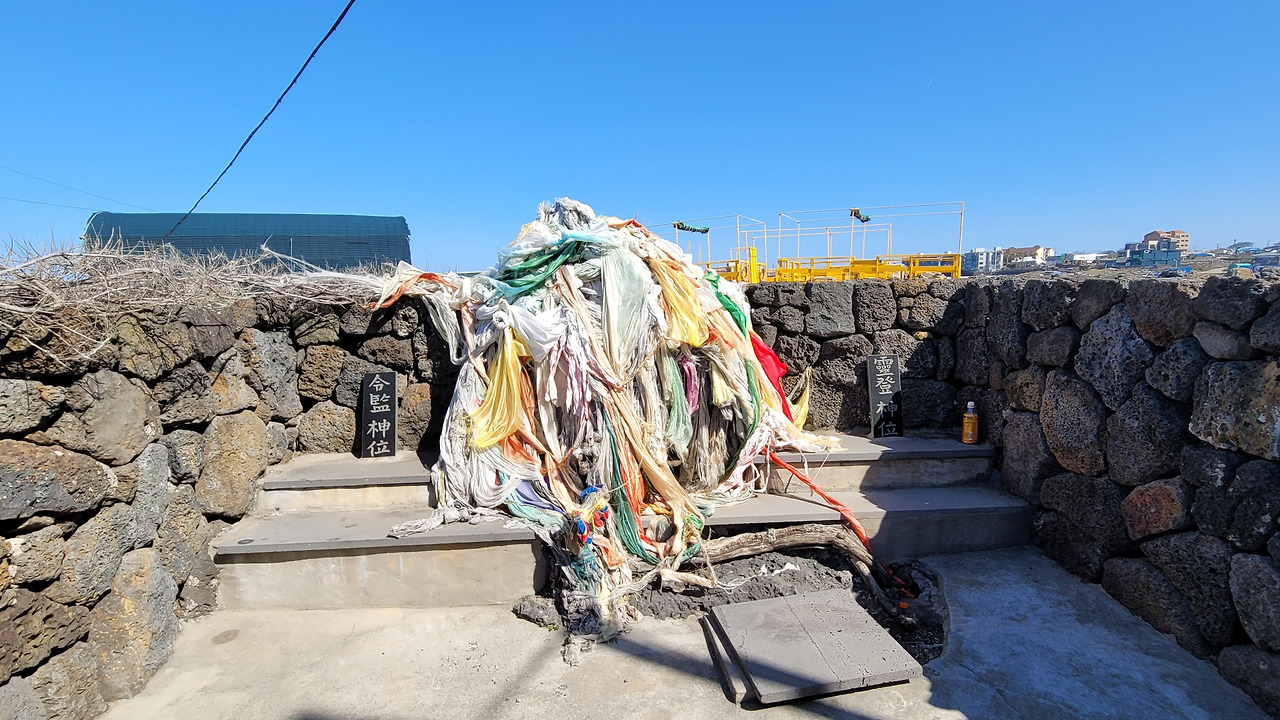 한수리 본향 개당은 해안일주도로를 건너 ‘하물’의 안쪽에 있다. 주로 어업을 관장하는 문 씨 할망을 모신 당이다. 바위틈에 나지막하게 자란 팽나무 신목에는 물색과 명실이 많이 걸려 있다. 하물에서부터 목재 데크가 놓여있어 만조 시에도 쉽게 접근할 수 있다.