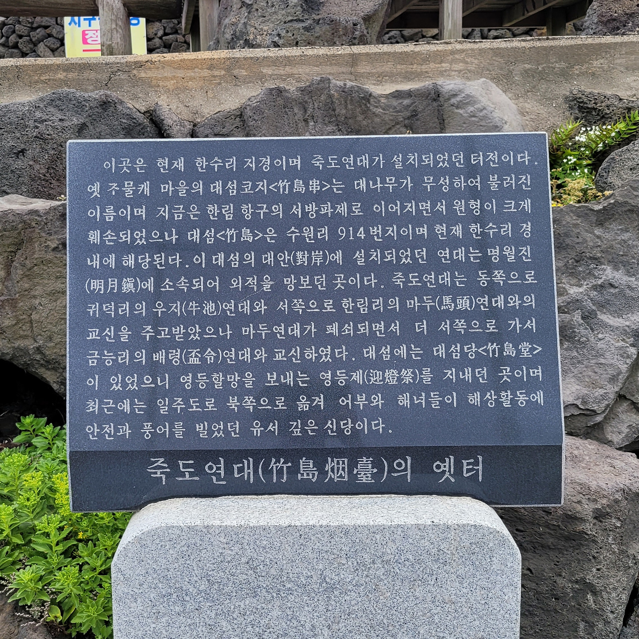 그 입구에 죽도연대의 옛터를 알리는 표지석이 있다. 명월진에 속하는 죽도연대는 동쪽으로 귀덕리의 우지연대와 서쪽으로 한림리의 마두연대와 연락을 주고 받았다. 마두연대가 폐쇄된 후에는 금능리 배령연대와 교신하던 곳이다.