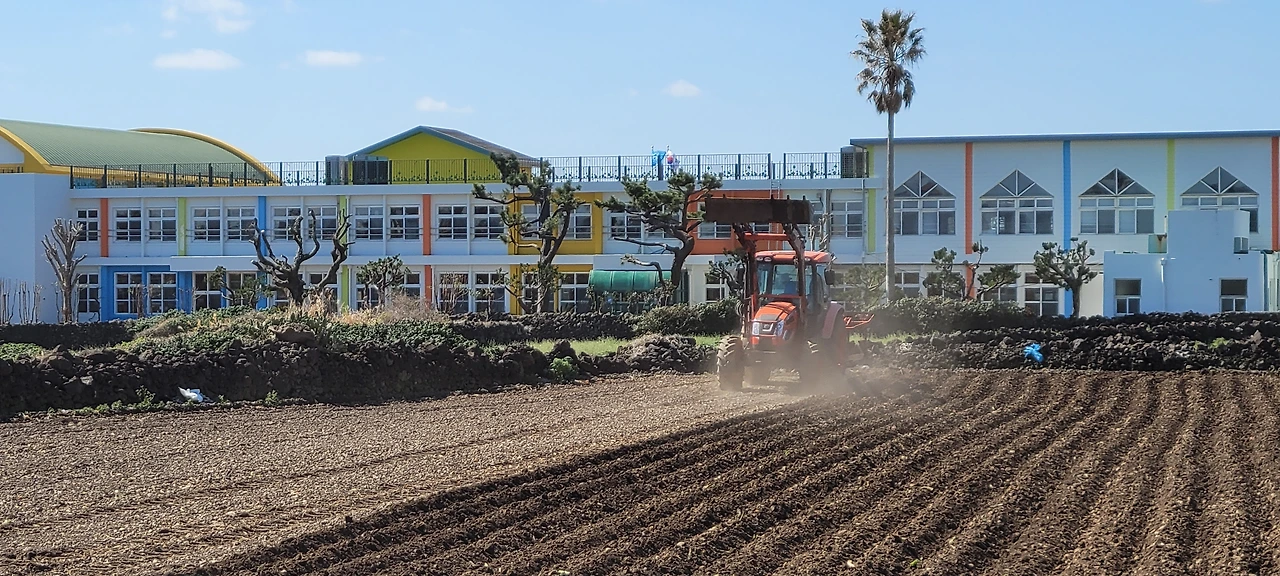 트랙터로 수원초등학교 뒤의 채소밭을 갈고 있다.