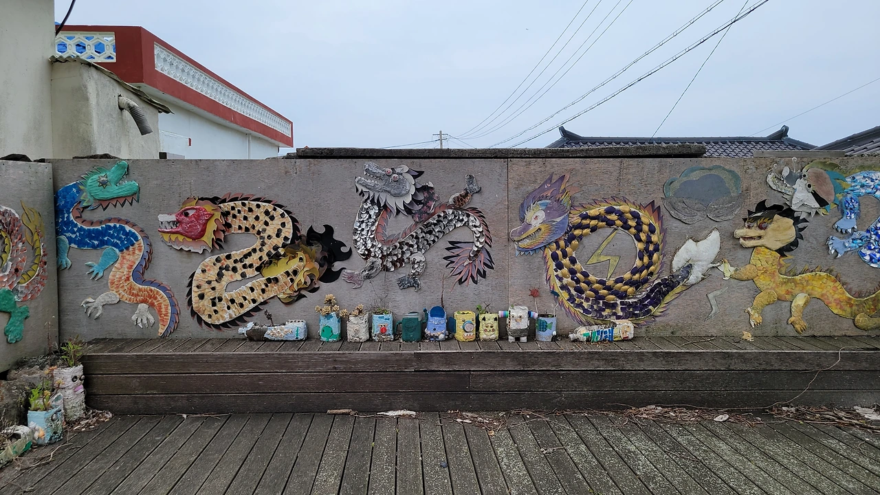 수원초등학교 앞을 지나간다. 마을 중앙의 오래된 나무 밑에 '구룡 소공원'이라는 작은 쉼터가 있다. 수원초등학교 어린이들이 재활용품으로 '수원리 마을 이야기'를 꾸며 놓았다. 수원리 마을에 전해 내려오는 '구룡석(九龍石)의 전설'을 소재로 표현한 작품이다. 어린이들의 예술적 감각에 감탄한다.