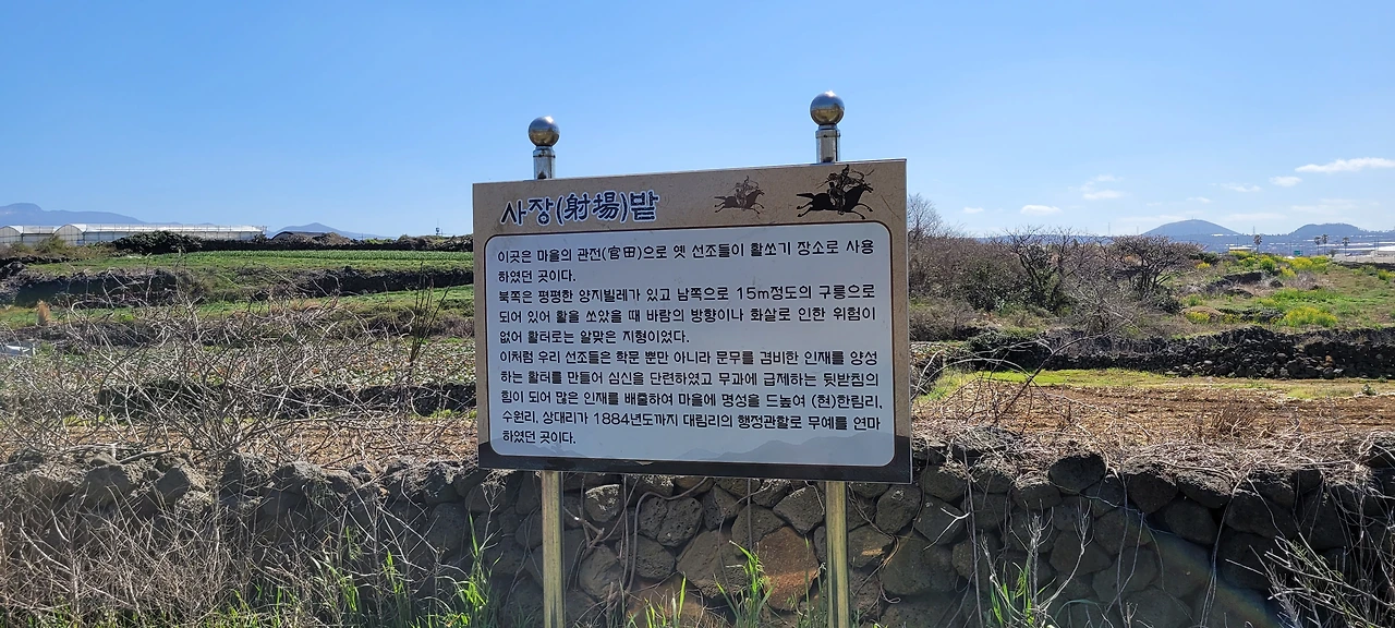 영새생물 인근의 양지빌레와 구릉이 있는 곳에 관전(官田)이었는데 조선시대 선조들이 활쏘기 연습을 하였던 ‘사장밧(射場밭)’이다.