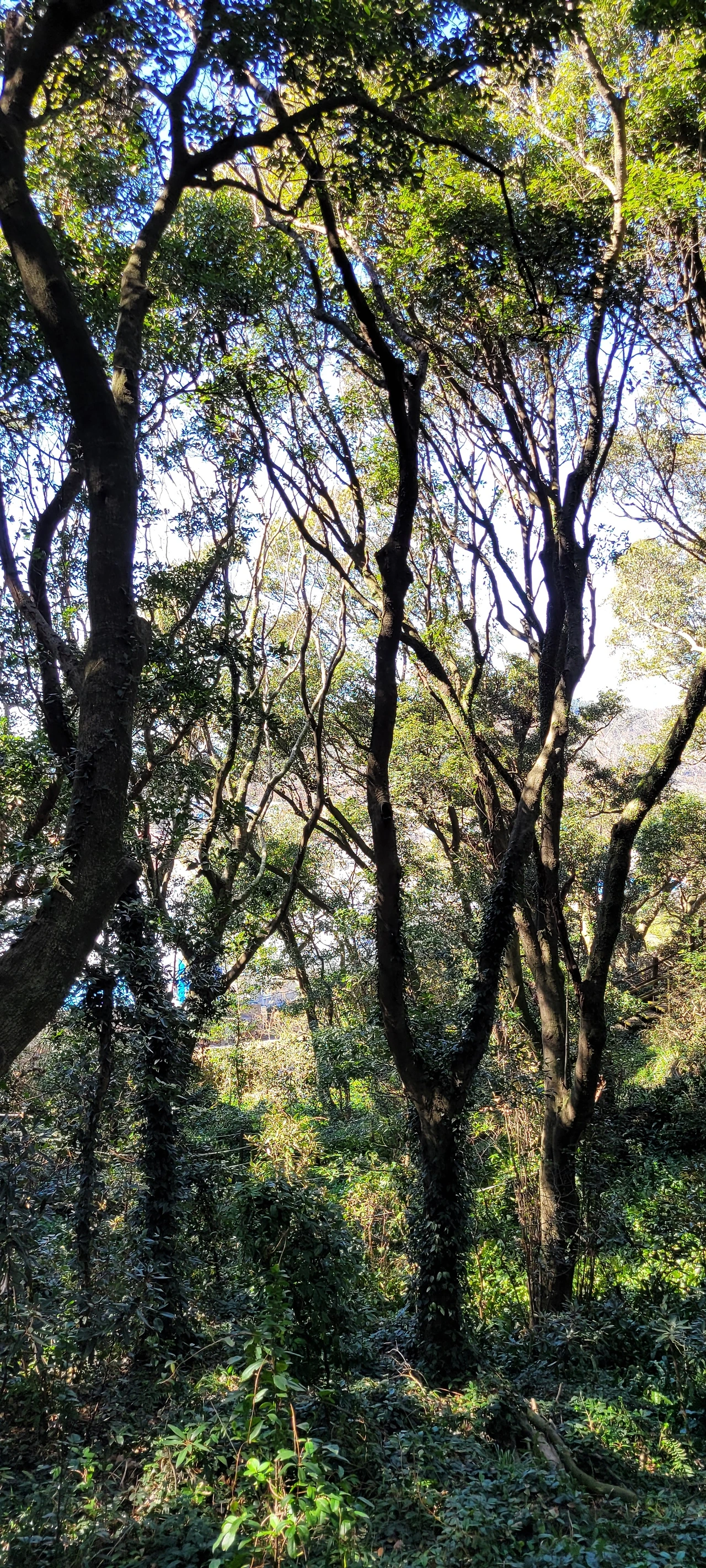 후박나무, 곰솔, 푸조나무, 생달나무, 식나무, 종가시나무, 아왜나무, 동백나무, 메밀잣밤나무 등 한겨울에도 울창한 상층목을 후추등이 감아 오른다.