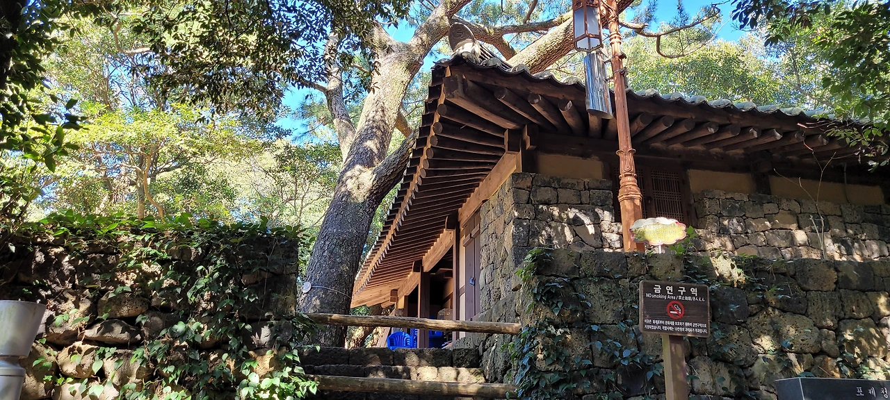 좀 더 가면 납읍초등학교 앞에 금산공원으로 오르는 나무계단이 있다. 이번 올레길의 하이라이트인 '납읍리 난대림지대'다. 노꼬메오름에서 솟아오른 용암이 흘러내려 형성된 애월 곶자왈의 환상적인 난대림이 하늘을 가리고 있다.