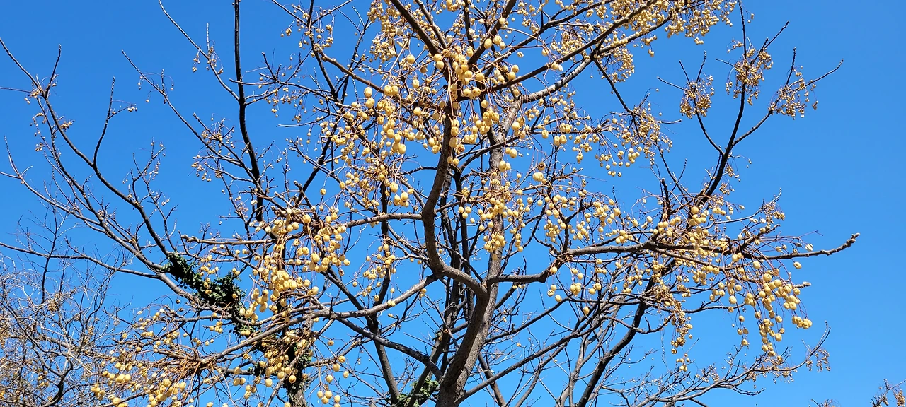 ‘정워리연못’가에 멀구슬나무가 누렇게 익은 열매를 달고 있다.