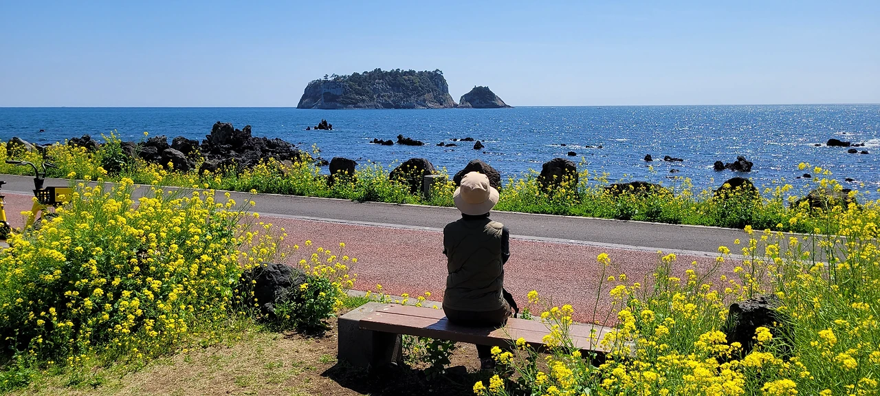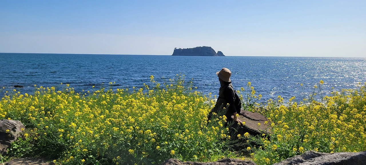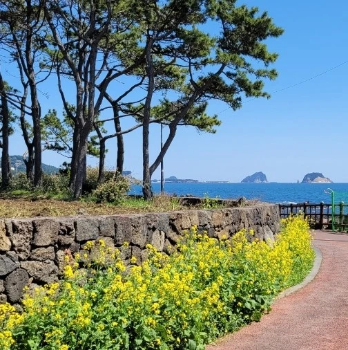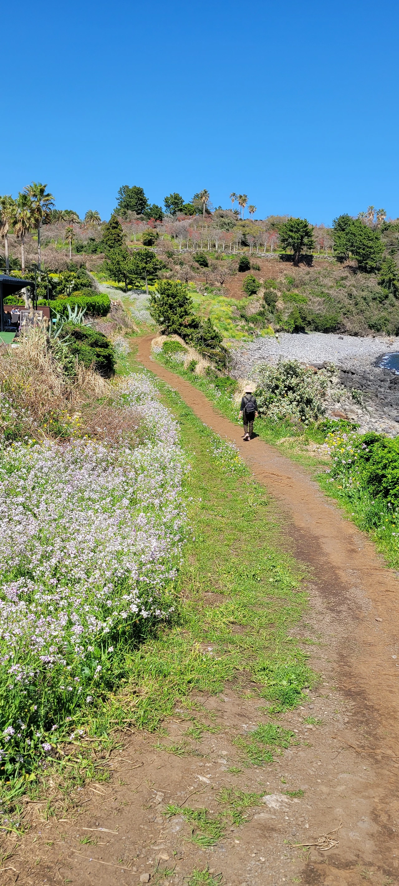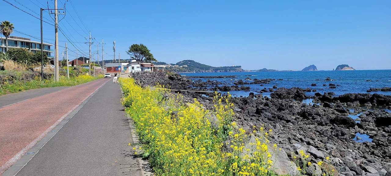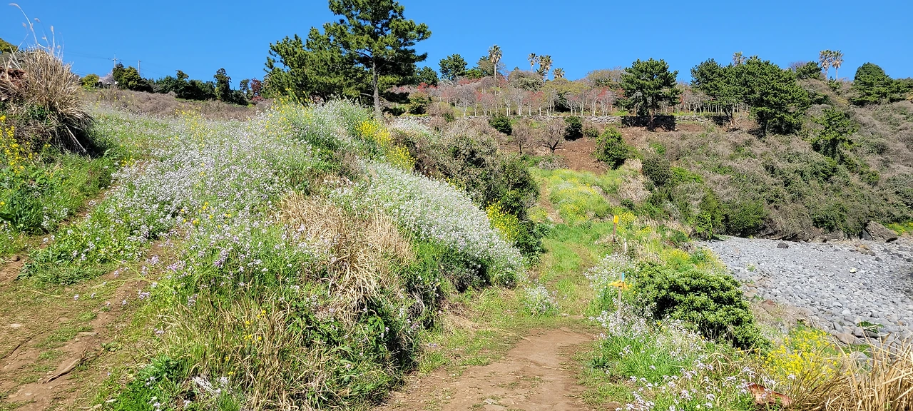 검푸른 바다와 노란 유채꽃의 자존심 대결장을 수봉로 자갈길이 적당한 간격으로 갈라놓는다. 뒤로 야자수와 상록수림이 에워싸고 있고, 가느다란 올레길만 내어준다. 멀리 삼매봉에 KBS 송신탑이 보인다.