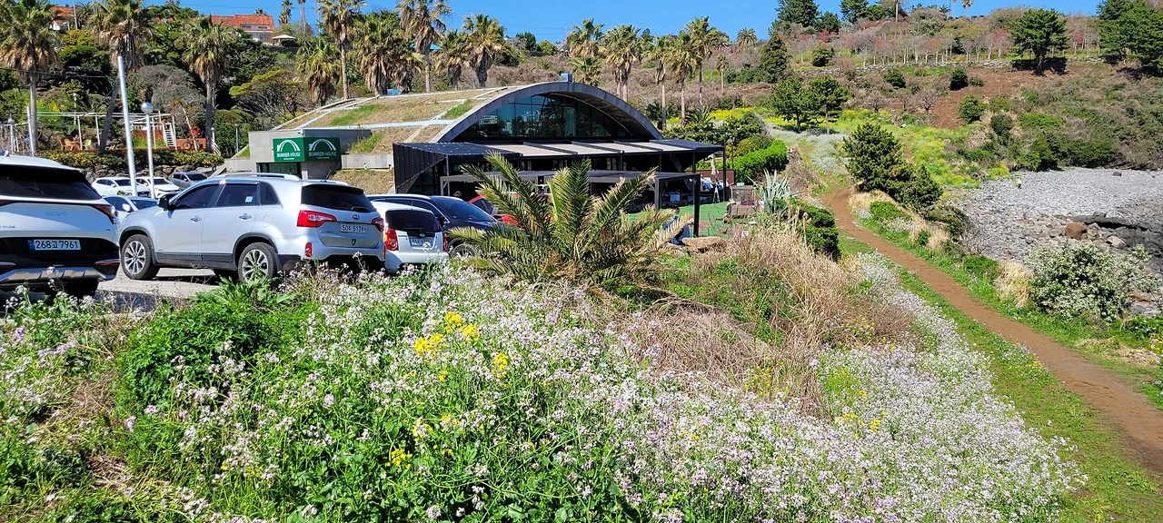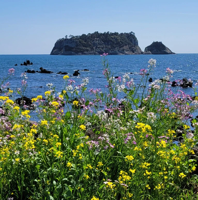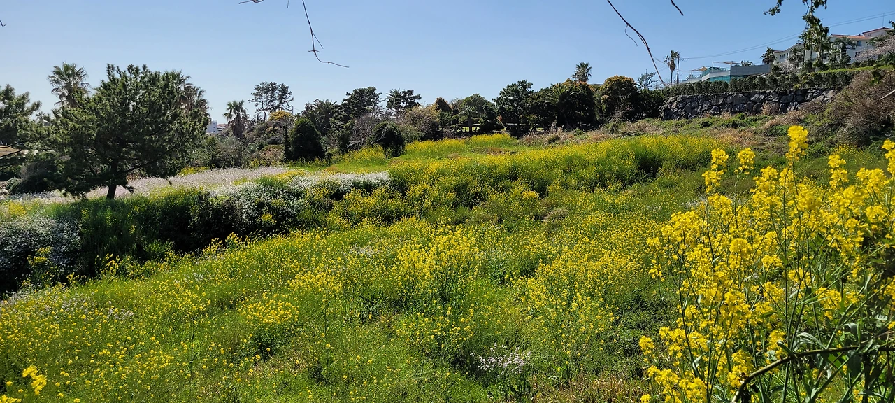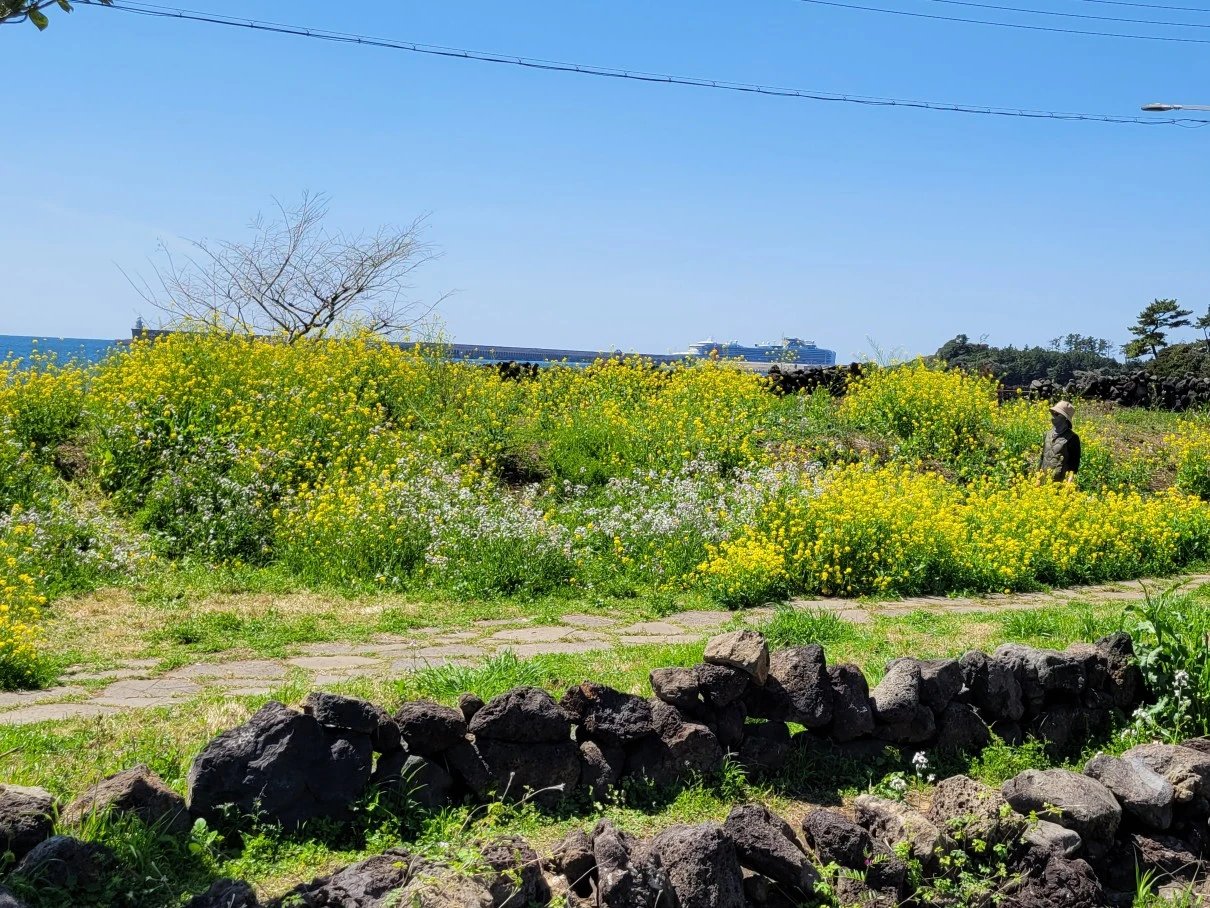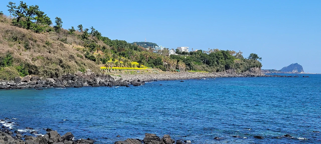 검푸른 바다와 노란 유채꽃의 자존심 대결장을 수봉로 자갈길이 적당한 간격으로 갈라놓는다. 뒤로 야자수와 상록수림이 에워싸고 있고, 가느다란 올레길만 내어준다. 멀리 삼매봉에 KBS 송신탑이 보인다.