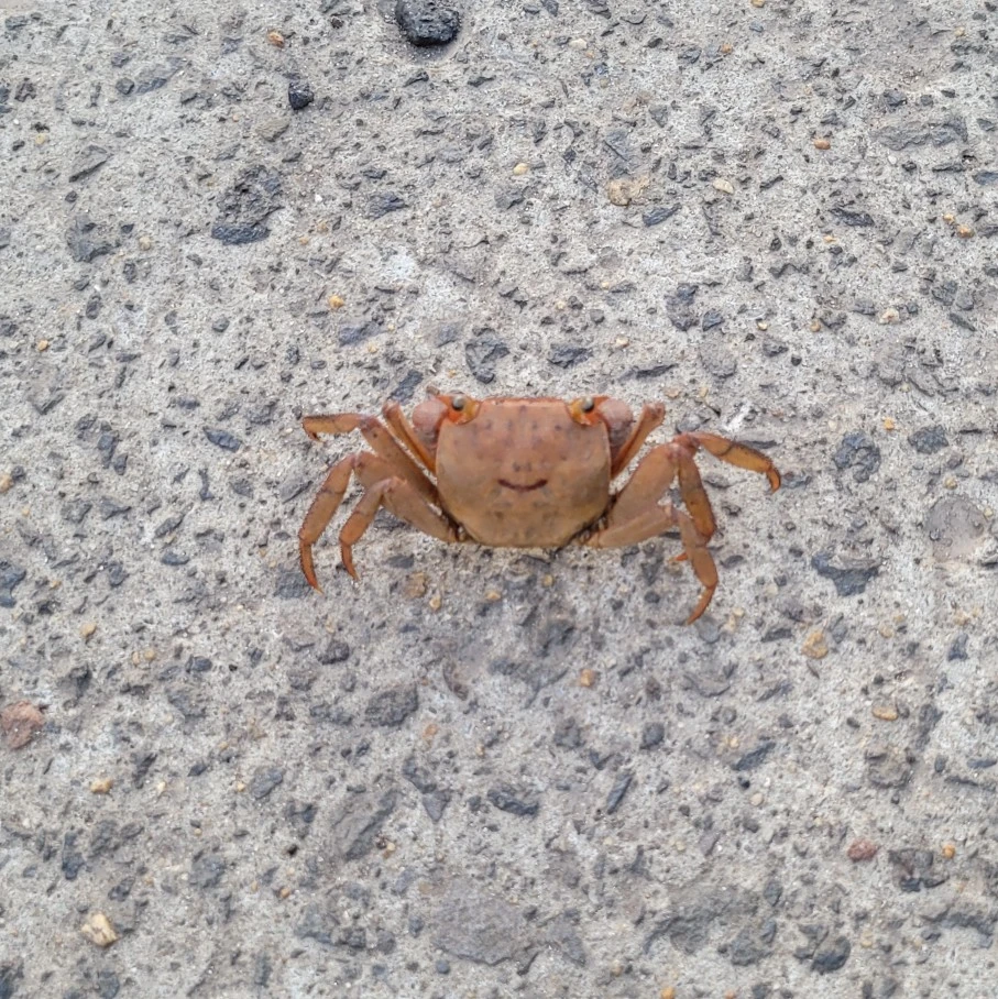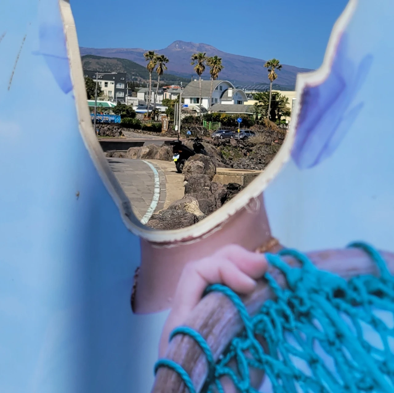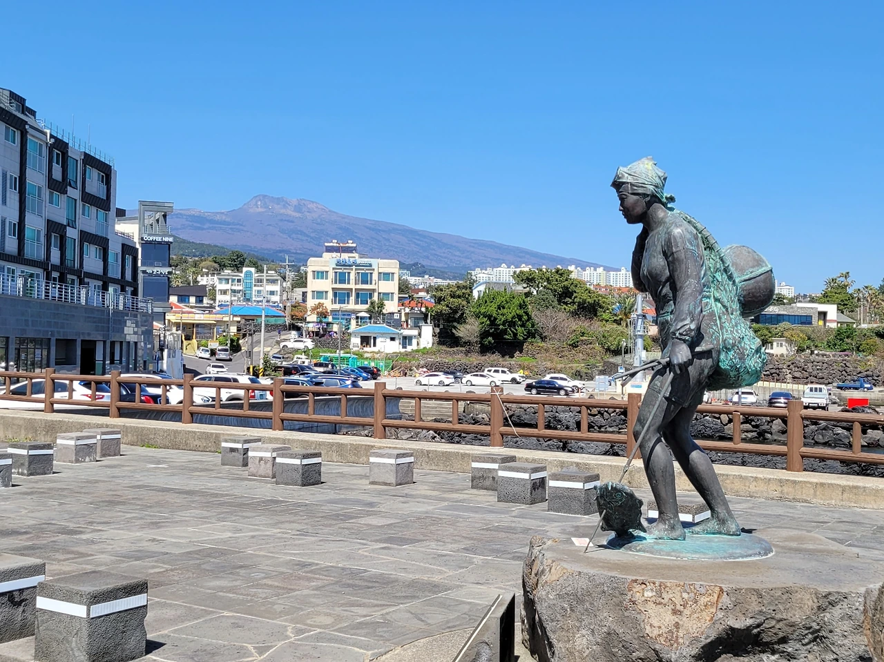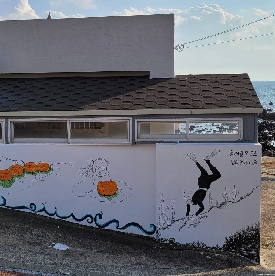 보도로 게가 기어올라 온다. 여유롭게 옆으로 게걸음을 한다. 해녀의집 담장에 해녀들의 물질하는 벽화가 그려져 있다. '테왁과 망사리를 멘 해녀' 포토존의 얼굴 사이로 한라산이 내려다보고 있다.