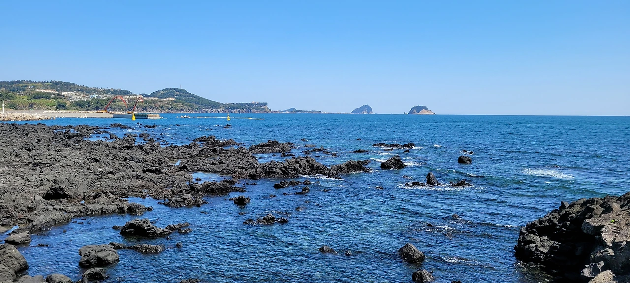 법환포구에서 동쪽으로 바라보면 삼매봉과 서귀포층 해안절벽, 새연교, 새섬, 섶섬, 문섬이 차례로 펼쳐진다.