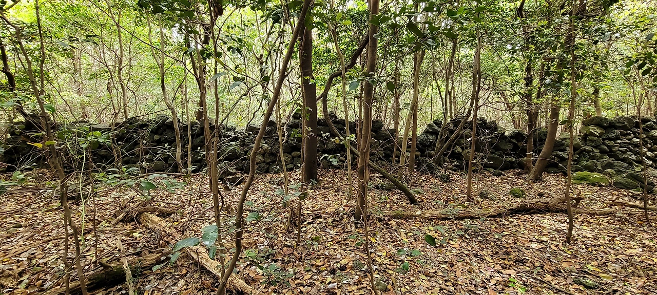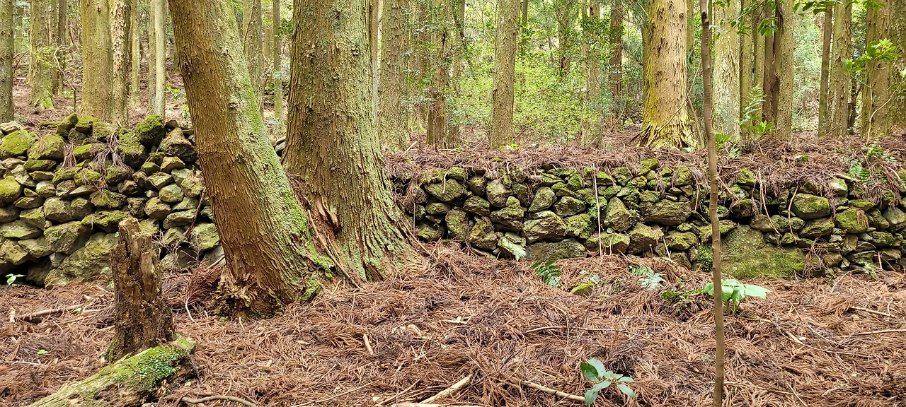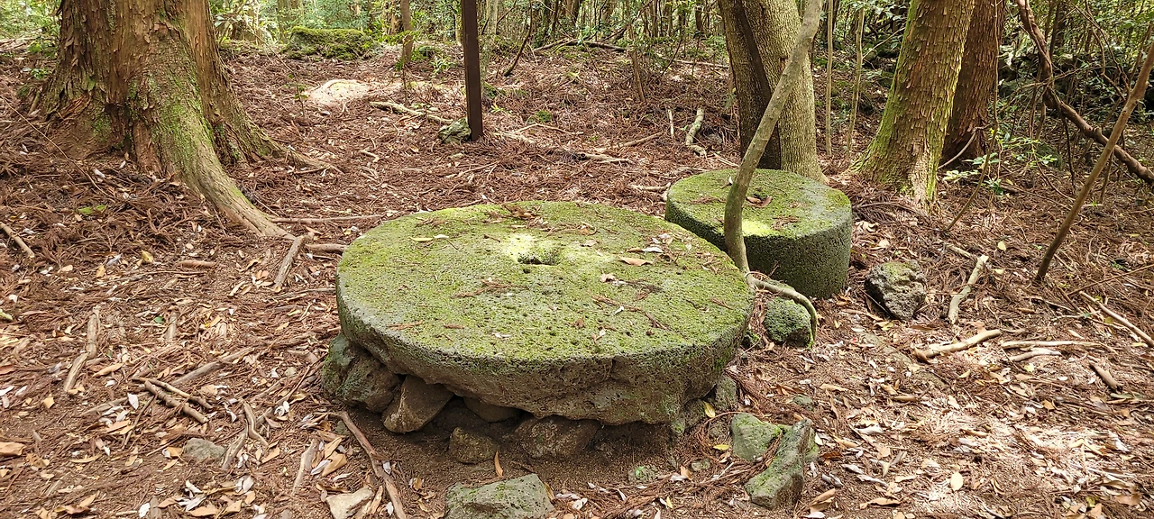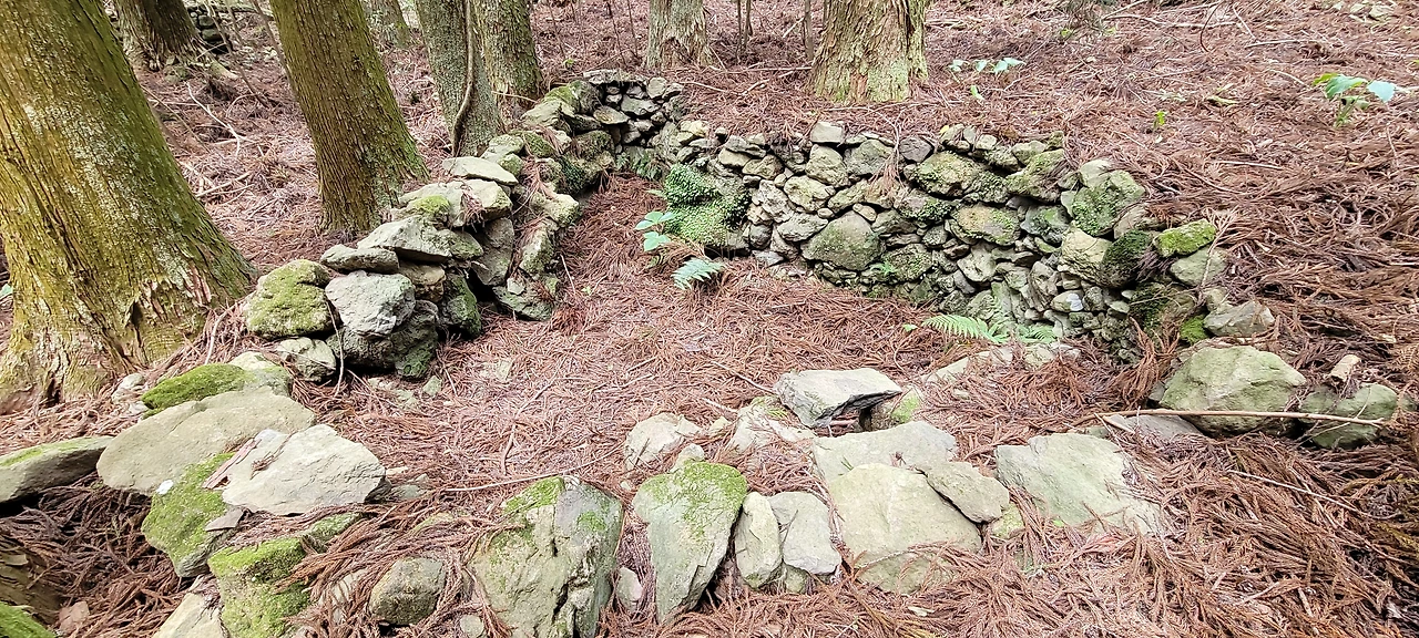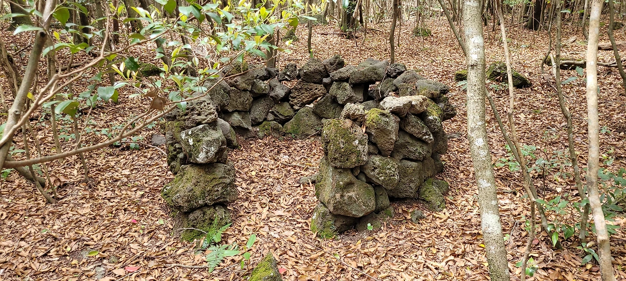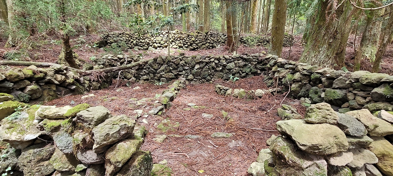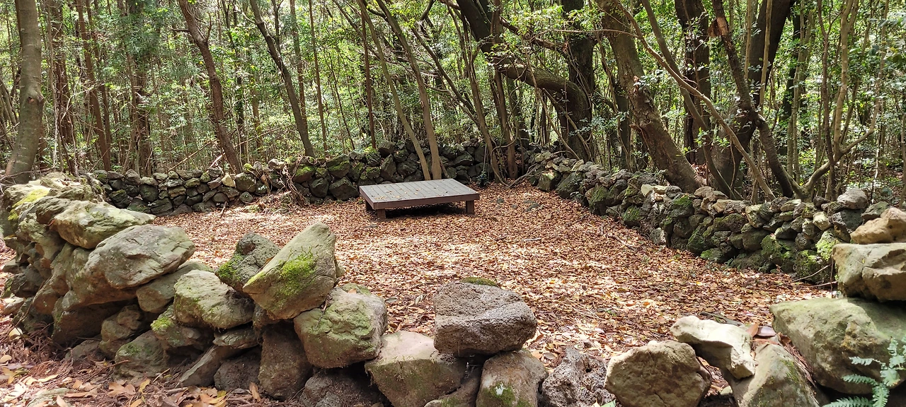 사농바치터. 사농바치는 제주어로 사냥꾼이다. 사농바치터는 옛날 한라산 숲길을 오가던 사냥꾼들의 쉼터다. 거센 비바람에도 견딜 수 있게 둥근 형태의 허튼층쌓기 한 옛사람들의 지혜가 돋보인다.