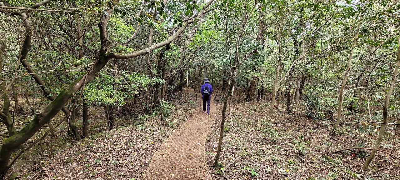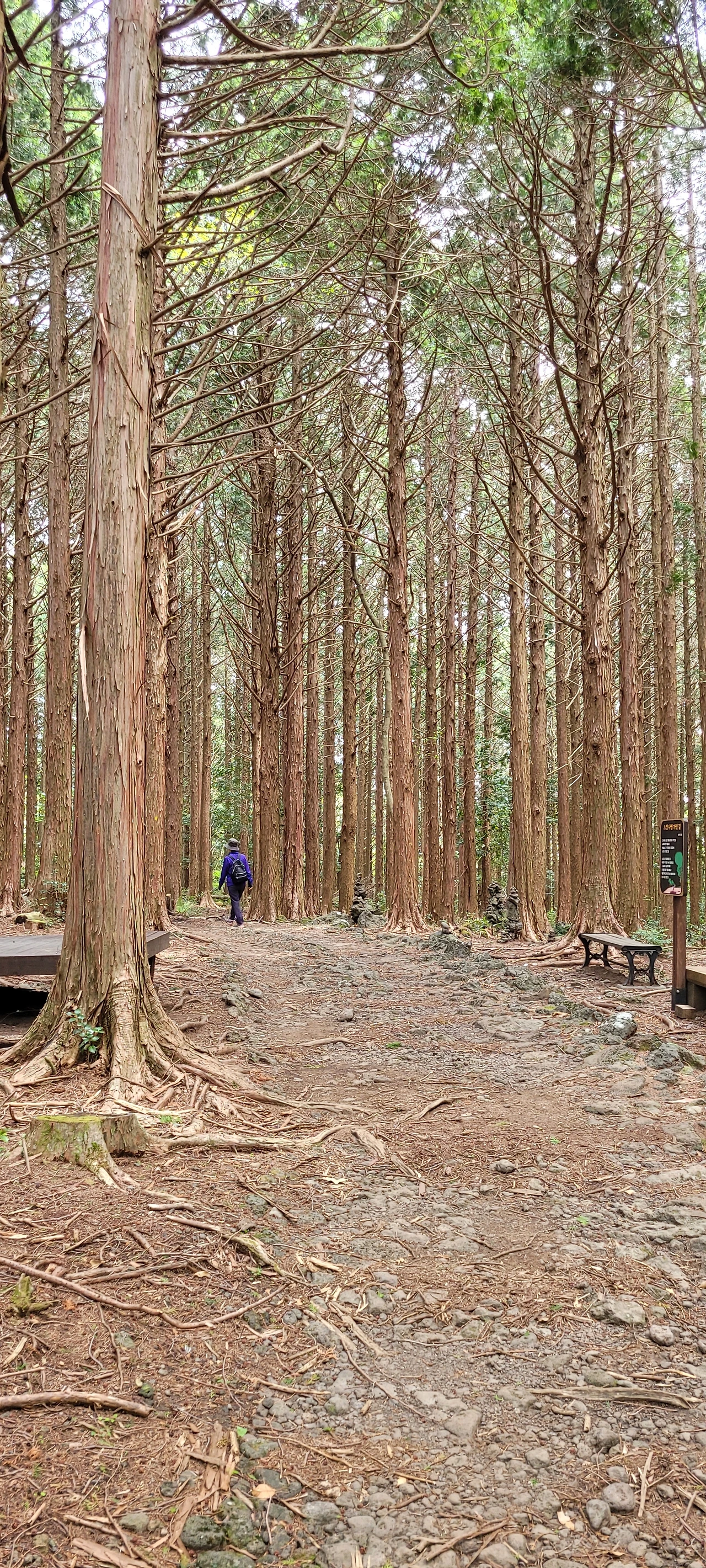 추억의 숲길은 한라산 둘레길(동백길)에 닿는다. 100m쯤 떨어진 곳에 편백나무 인공조림지가 있다. 3~40m가 족히 넘는 아름드리 편백나무가 곧고 미끈하게 자라서 하늘을 가리고 있다. 질서 정연하고 시원해 보인다. 한마디로 잘 생긴 나무다.