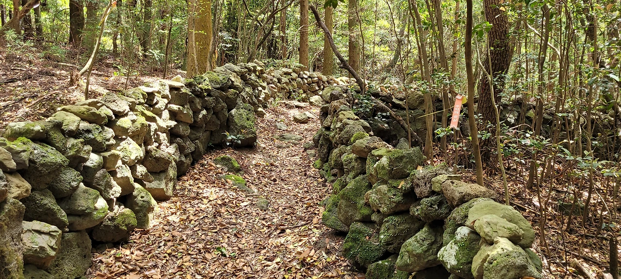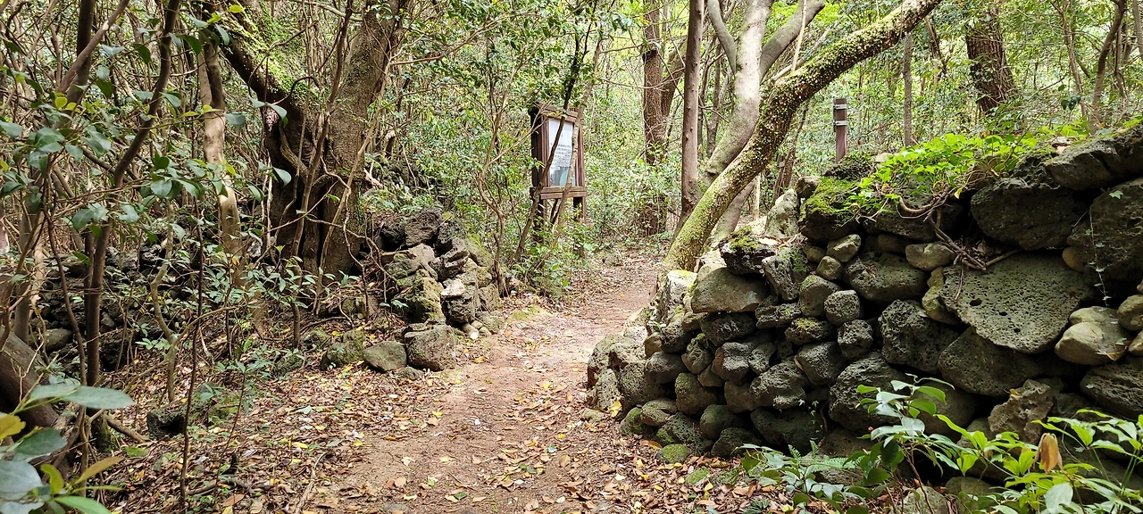 숲길은 돌담을 따라간다. 서홍동 마을 공동목장의 돌담(잣담)이다. 옛사람들의 숨결과 얼이 살아 있다. 조선시대 관영 목장의 울타리 돌담을 잣성, 장성이라 부른다. 해발 350~450m 일대의 잣성을 중잣성이라 한다. 일반 우마 목장의 돌담은 보통 잣담이라 한다.
