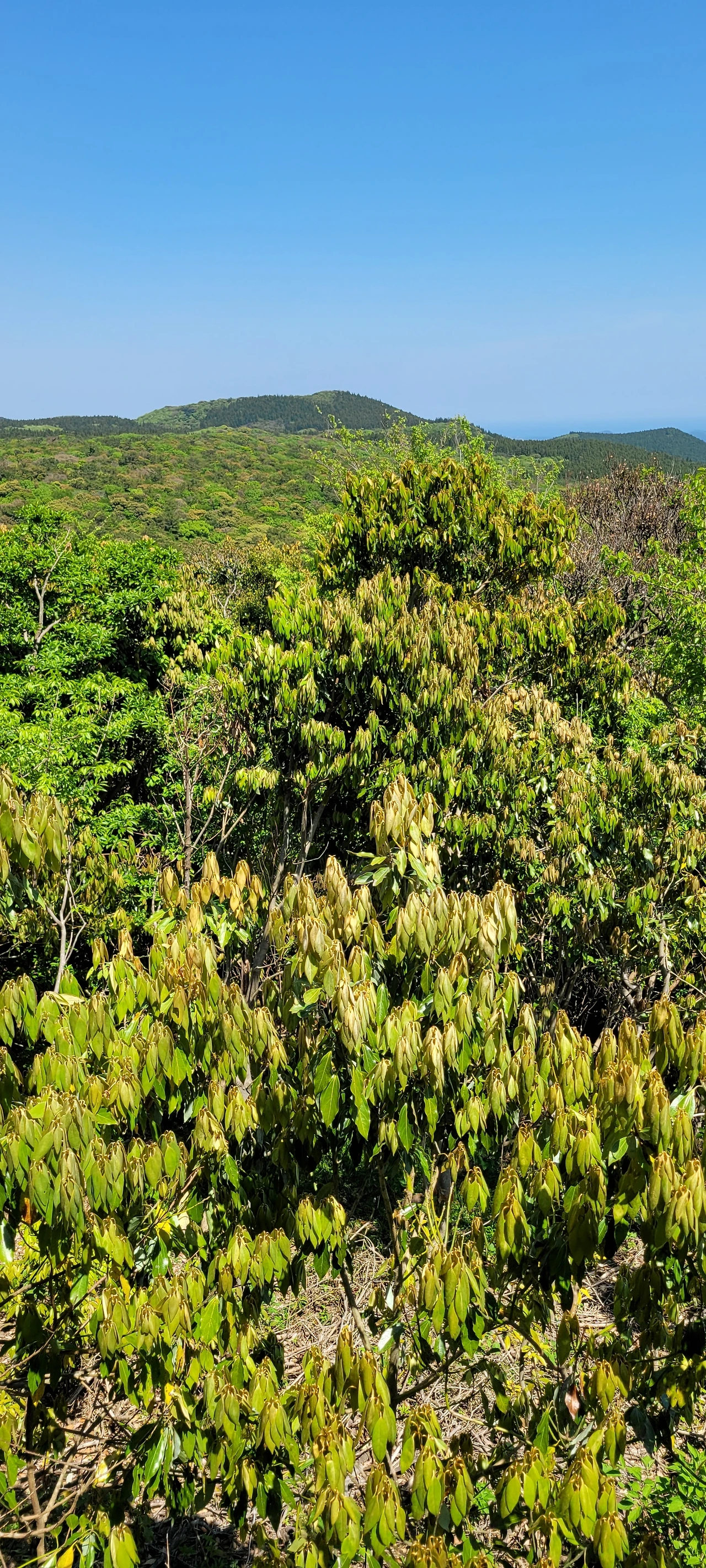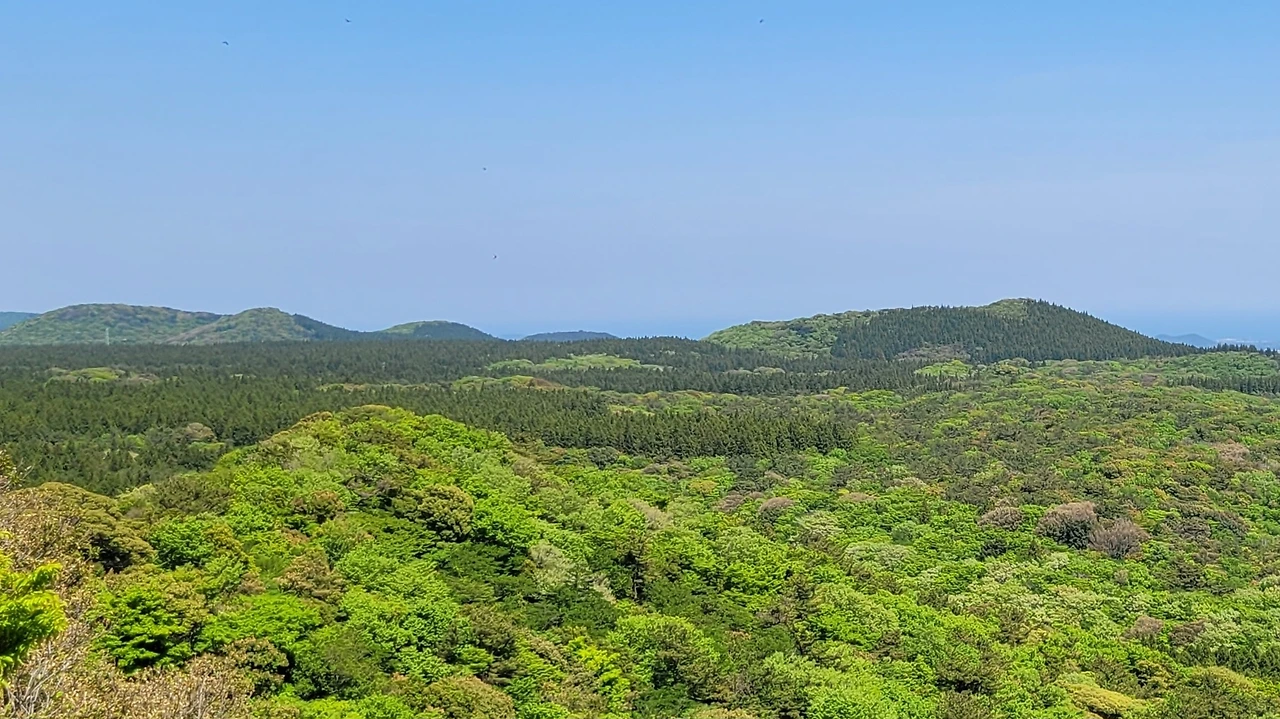오름 정상에 서서 동수악, 논고악, 성널오름, 사라오름을 거쳐 비스듬히 한라산으로 이어지는 산세를 바라본다. 울울창창한 난대림에 한동안 넋을 잃는다.