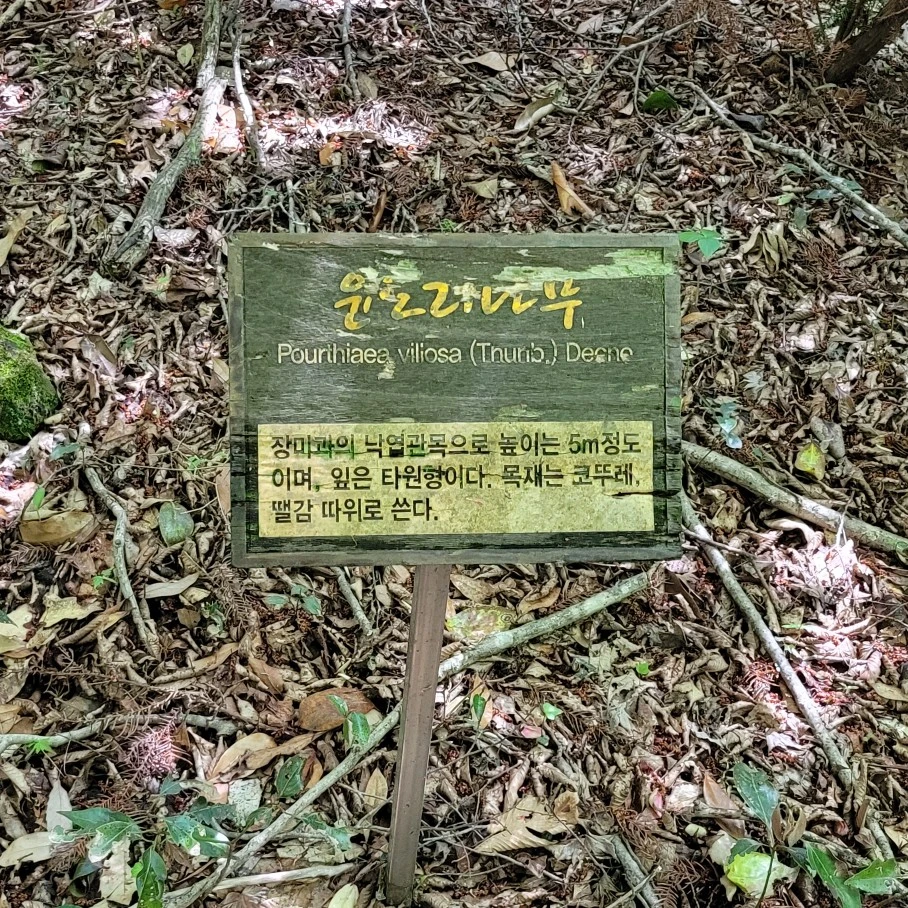탐방로 입구부터 활엽수림이 하늘을 가린다. 참나무, 소나무, 굴거리나무, 말오줌때가 맞이한다.