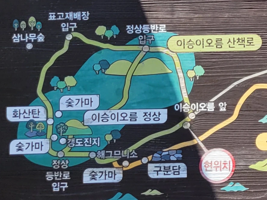 두 번째 전망대가 정상이다. 이승악은 표고 539m, 비고 114m의 오름 정상에도 나무가 빽빽하다.