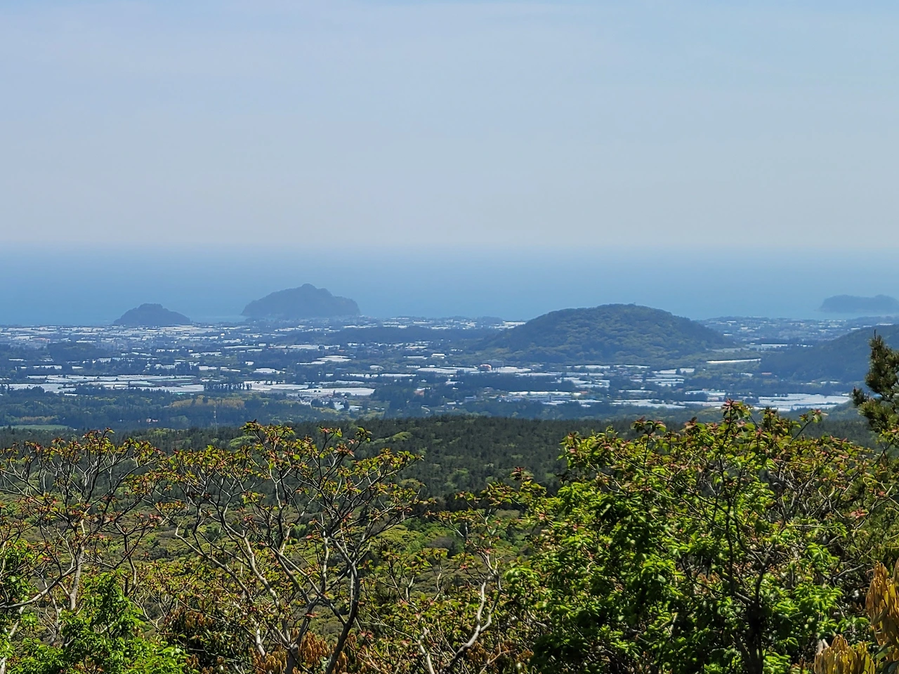 전망대에 오르면 남동쪽으로 서귀포 앞바다가 가까이 다가온다. 섶섬, 문섬, 범섬이 한가로이 떠 있고, 고근산이 이를 지키고 섰다. 그 사이에 한라산 난대림이 펼쳐진다.