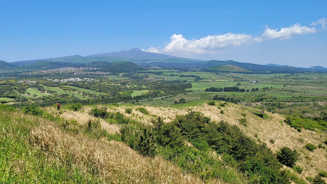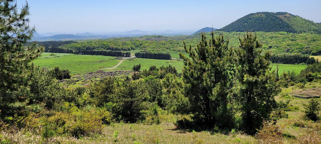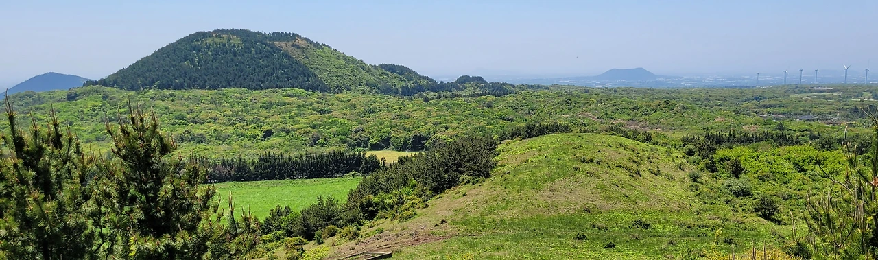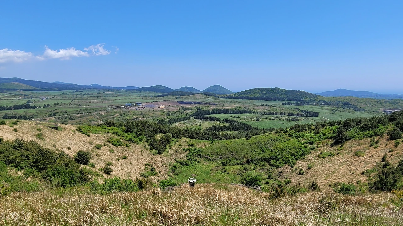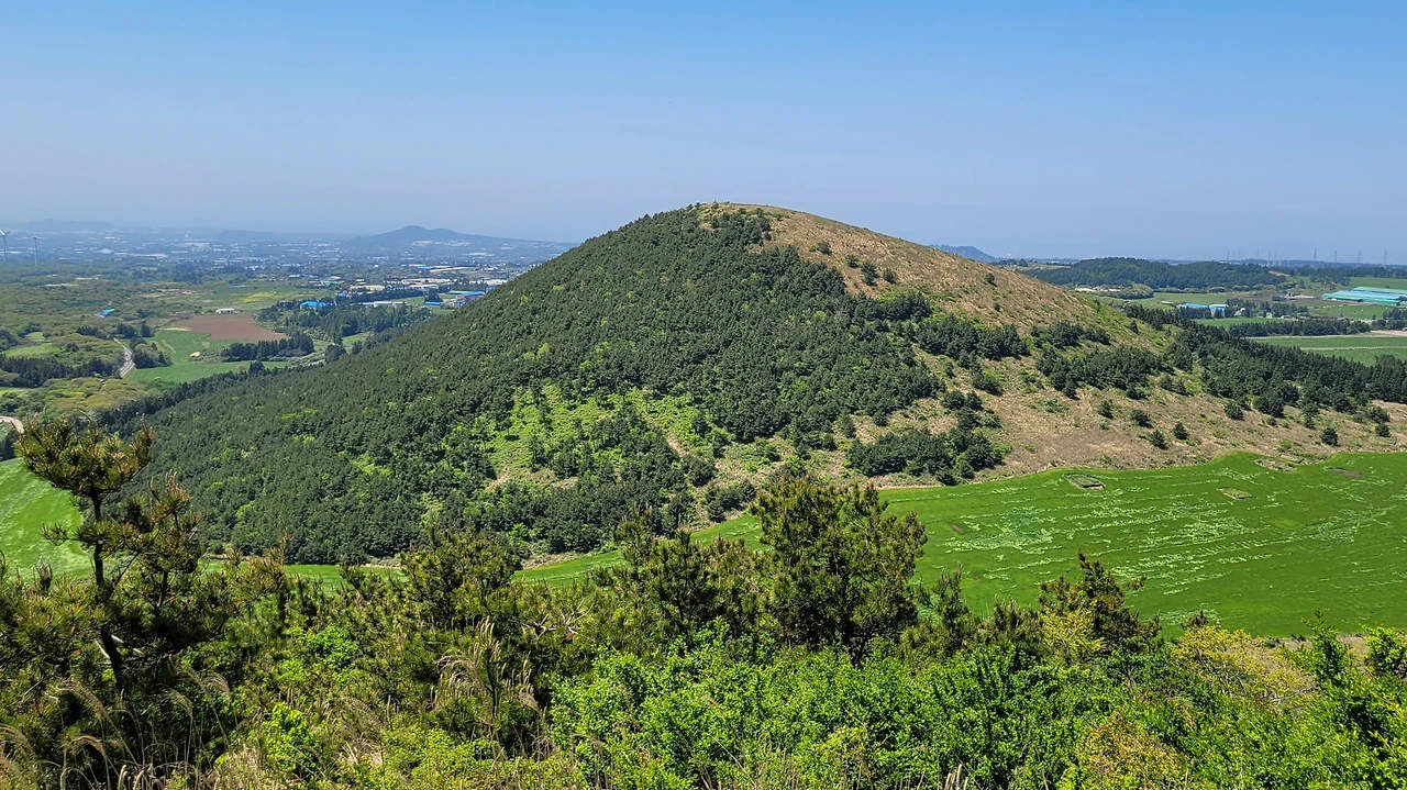 도너리오름과 그 너머로 남송이오름이 살짝 보인다. 더 멀리 왼쪽으로 산방산과 군산, 모슬봉이 그 특유의 존재감을 드러낸다. 뒤질세라 오른쪽 단산의 납작 엎드린 모습도 눈에 띈다. 도너리오름 주변의 곶자왈은 녹색 물결로 일렁인다.