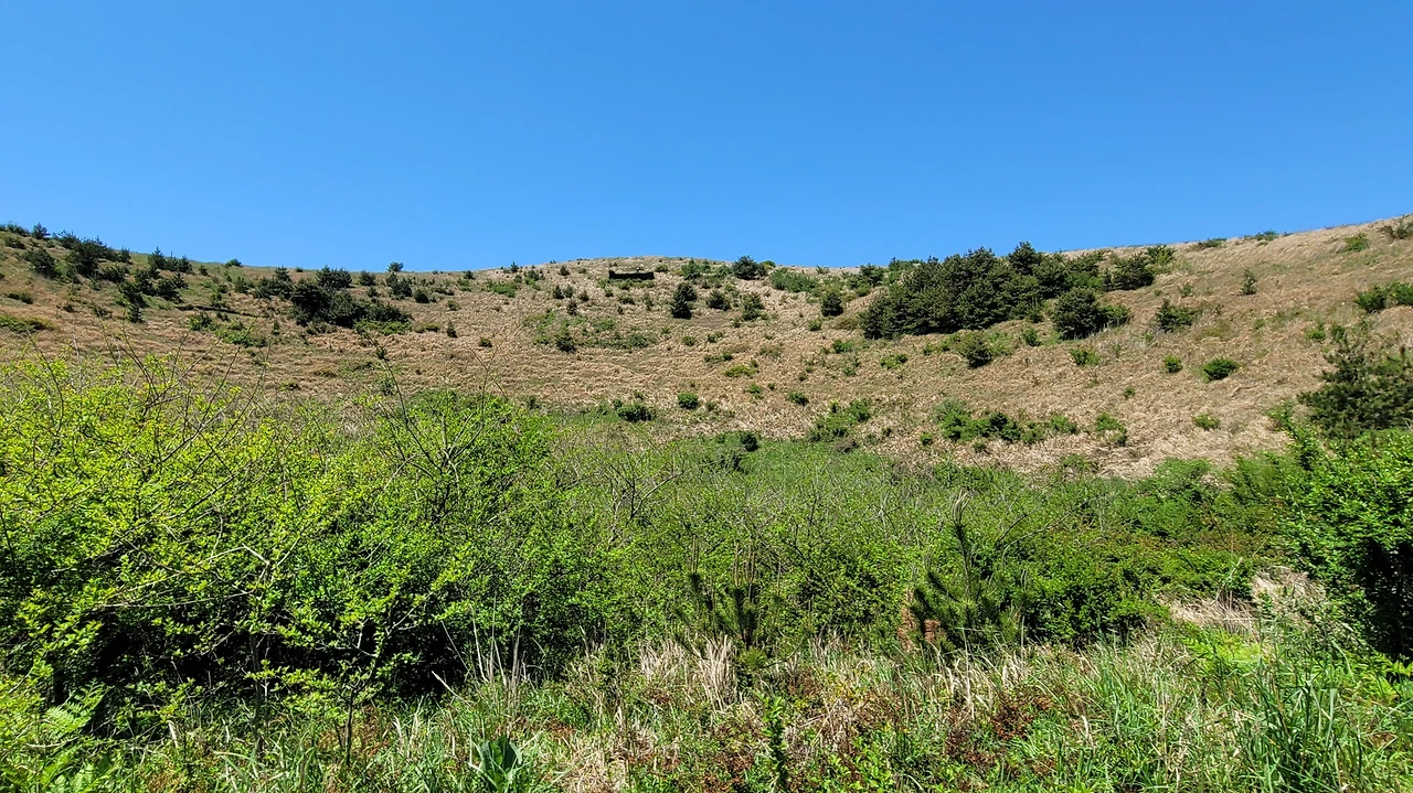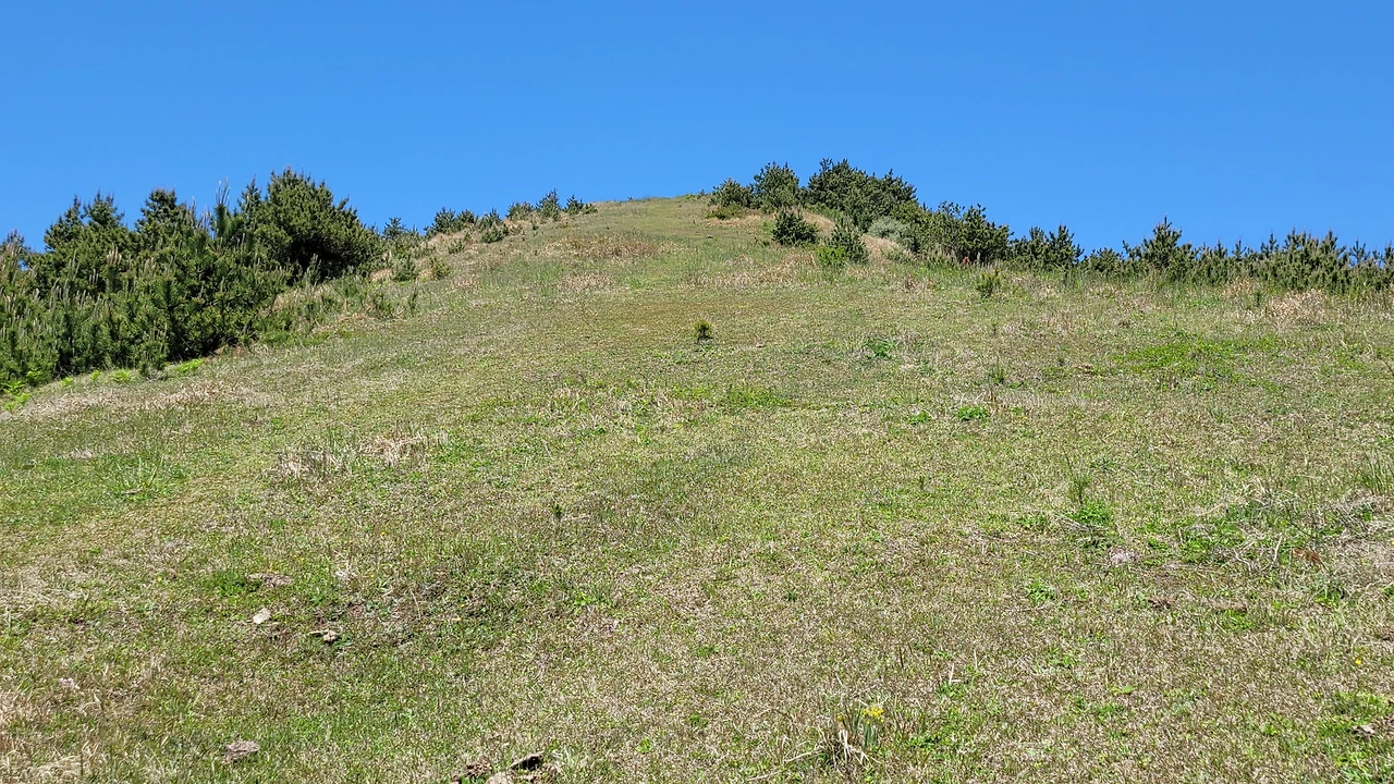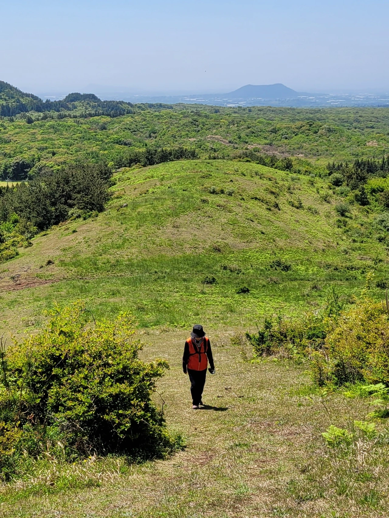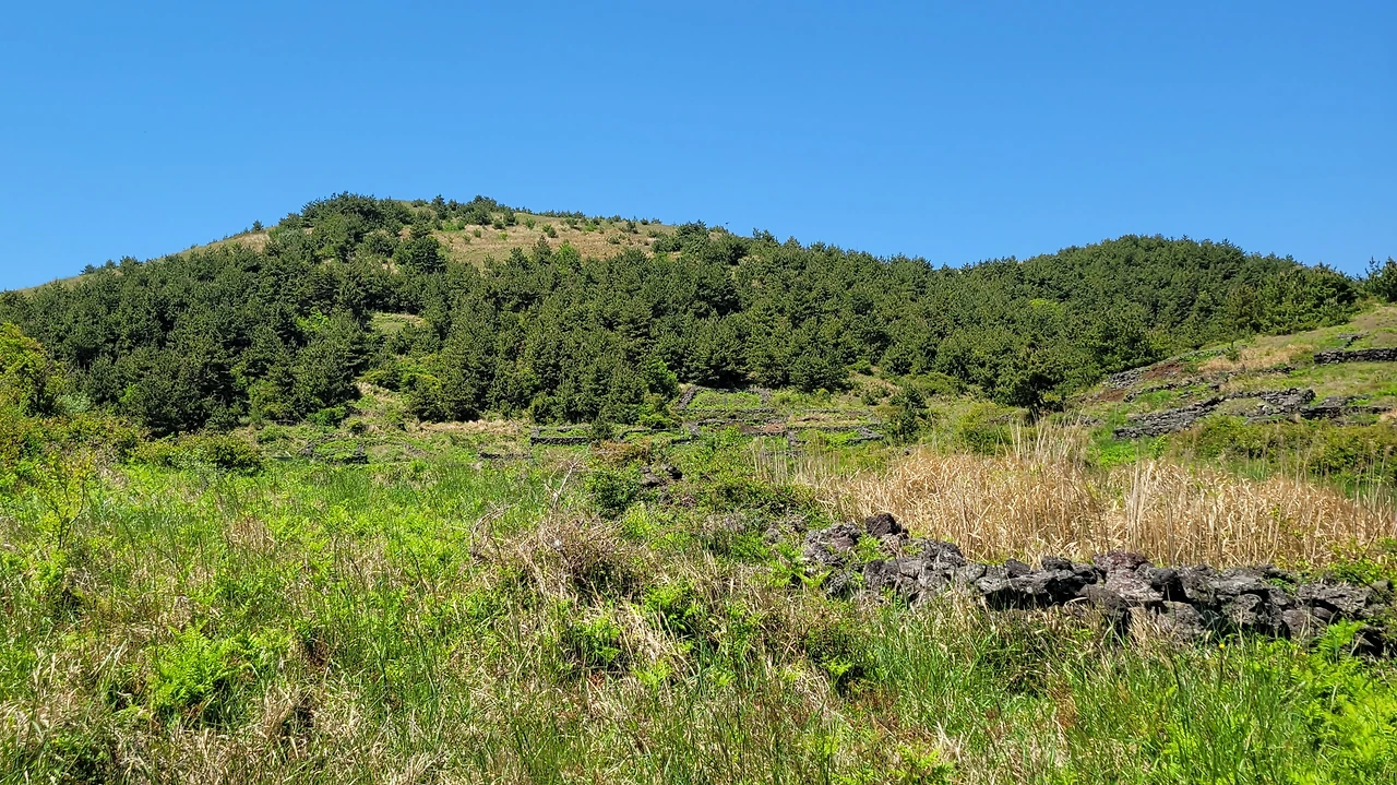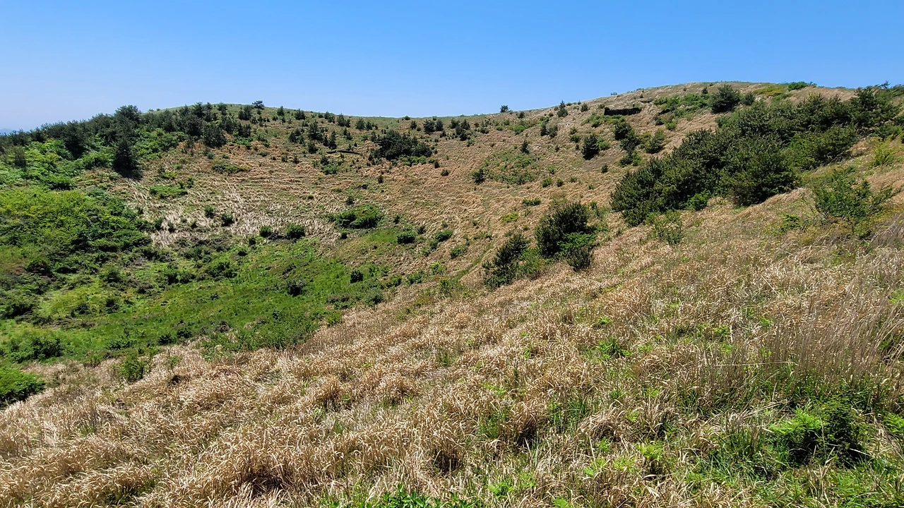 묘지 뒤쪽에 작은 나무들이 자라고 있고, 정상부에 가까운 쪽에는 나무가 거의 없는 초지다. 이리저리 헤매다가 정상을 보고 바로 치고 오른다. 20여 분이면 굼부리 능선에 닿지만 매우 가파른 길이다.