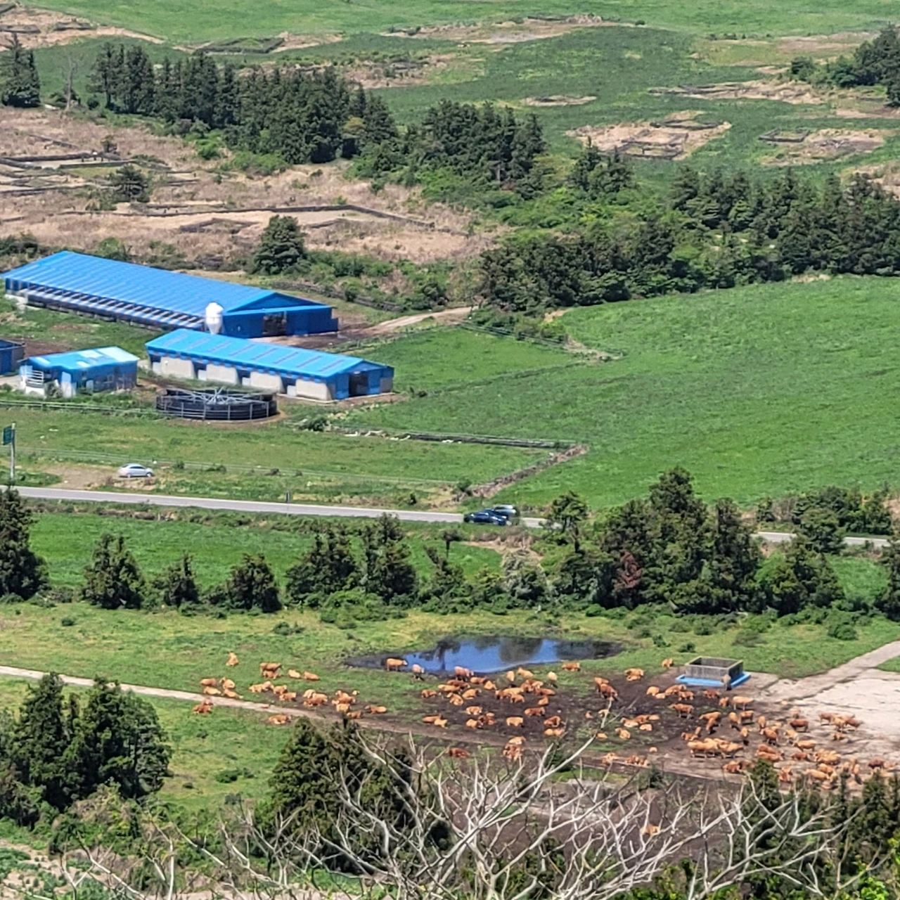 삼나무 조림지가 보이는 북동쪽 사면 아래로 목장의 방목지가 보인다. 소떼의 모습이 여유롭다.