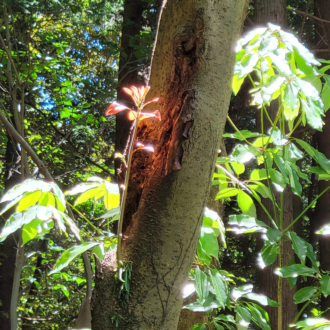 숲 사이로 비집고 들어온 햇빛을 받은 굴거리나무 새순