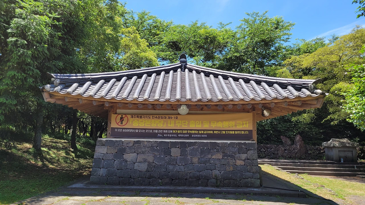 제주도를 이해하고 제주의 속살을 체험하려면 신당을 답사하라 했는데, 제주도 민속자료로 지정된 대표적인 마을 신당인 송당 본향당에 들어서도 기대와는 달리 별 감흥이 없다. '본향당 내 무단출입 및 무속행위 금지'라는 펼침막만 방문객을 환영한다.