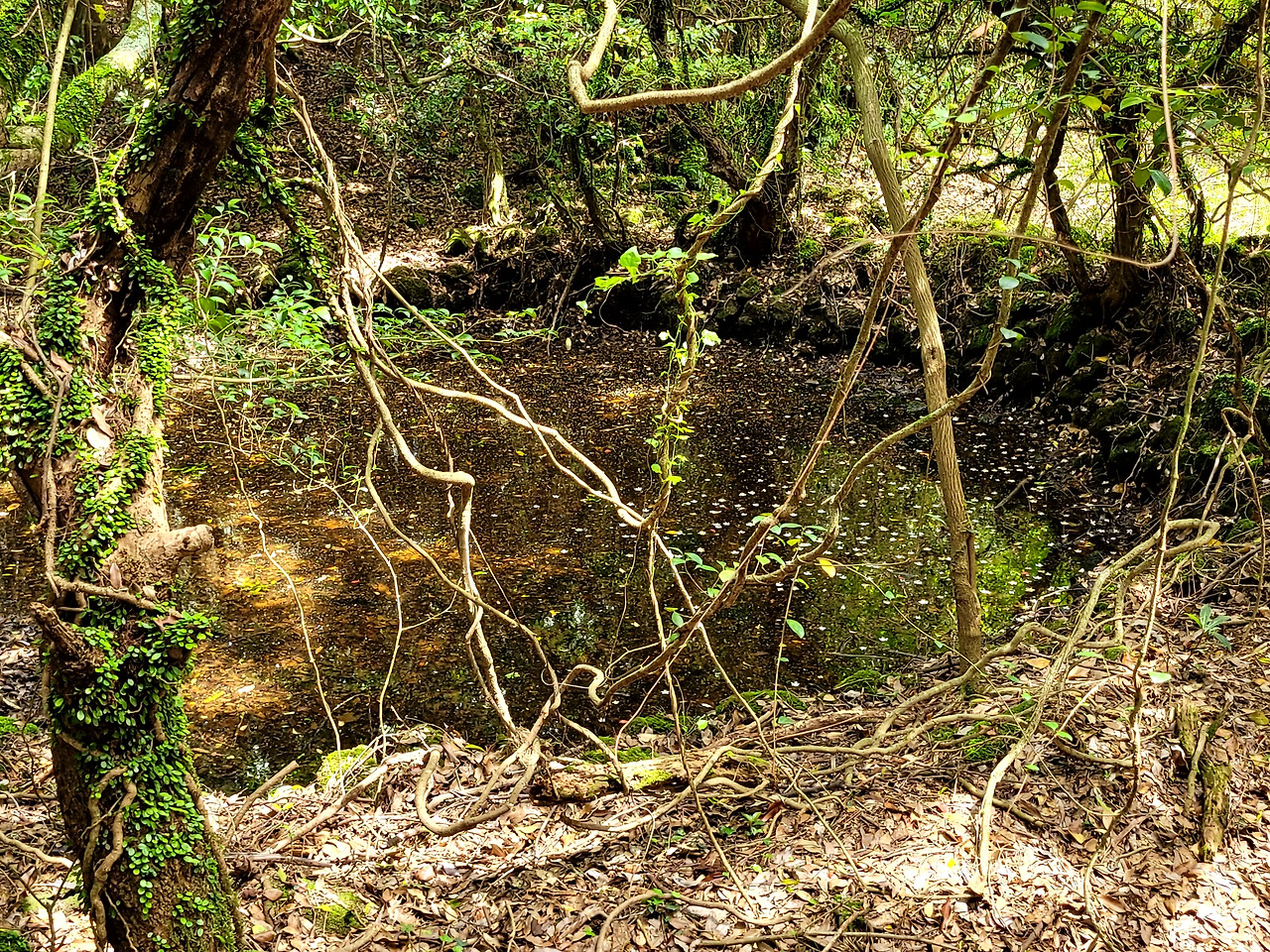 "제주에는 물이 빨리 빠져버리니 벼농사를 지을 수 없어요. 현재 유일하게 하논에서만 벼농사를 짓고 있습니다. 여기는 당못이라는 곳입니다. 예전에는 소출은 적었지만 이곳에서도 벼농사를 지었답니다. 이 숲에 일곱 곳 정도 흔적이 남아 있어요."
