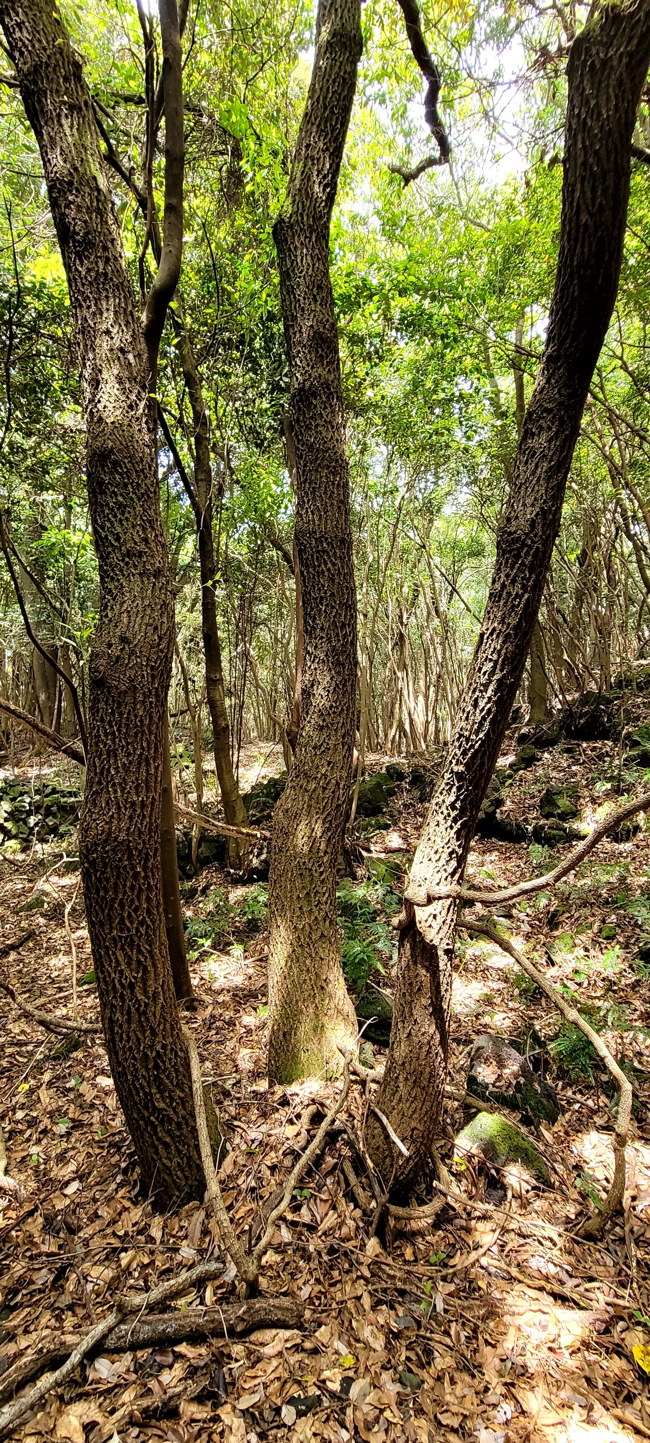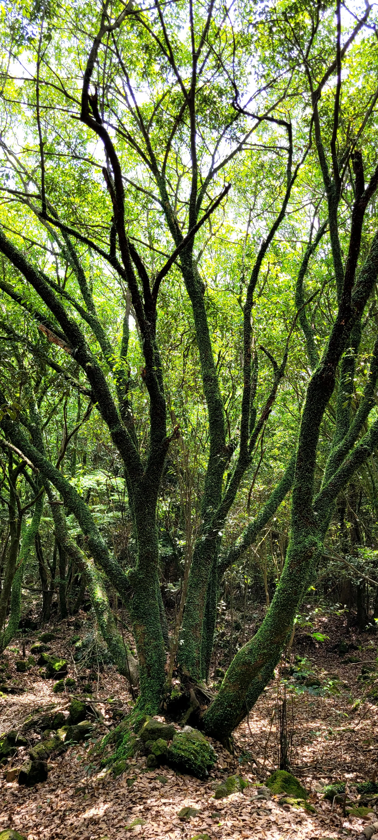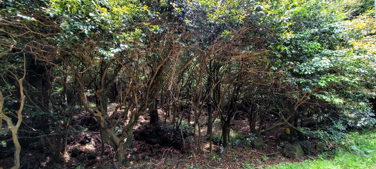 "선흘 곶자왈입니다. 화산 폭발로 흘러내린 용암이 지표를 덮은 대지 위에 습지와 용암 언덕들이 생깁니다. 그 깨진 돌무더기 틈 사이로 땅속 깊이 빗물이 스며들지요. 다시 그곳으로부터 수증기가 뿜어져 나와 온도와 습도를 일정하게 유지합니다. 양치류가 풍성하며, 난대성 상록수가 울창한 숲을 이루지요. 동백나무, 개가시나무, 종가시나무, 구실잣밤나무, 황칠나무 등과 같은 키가 훤칠하게큰 나무를 볼 수 있습니다."