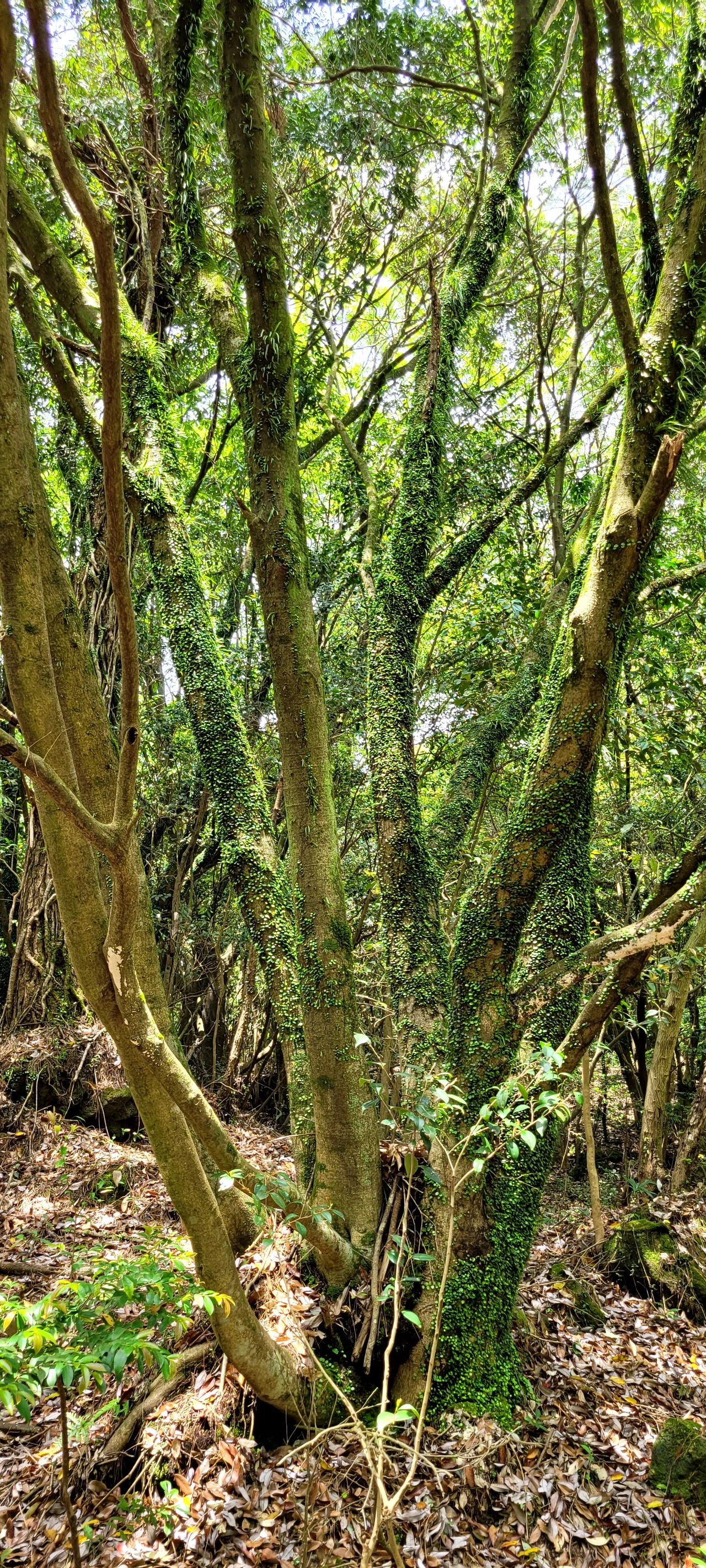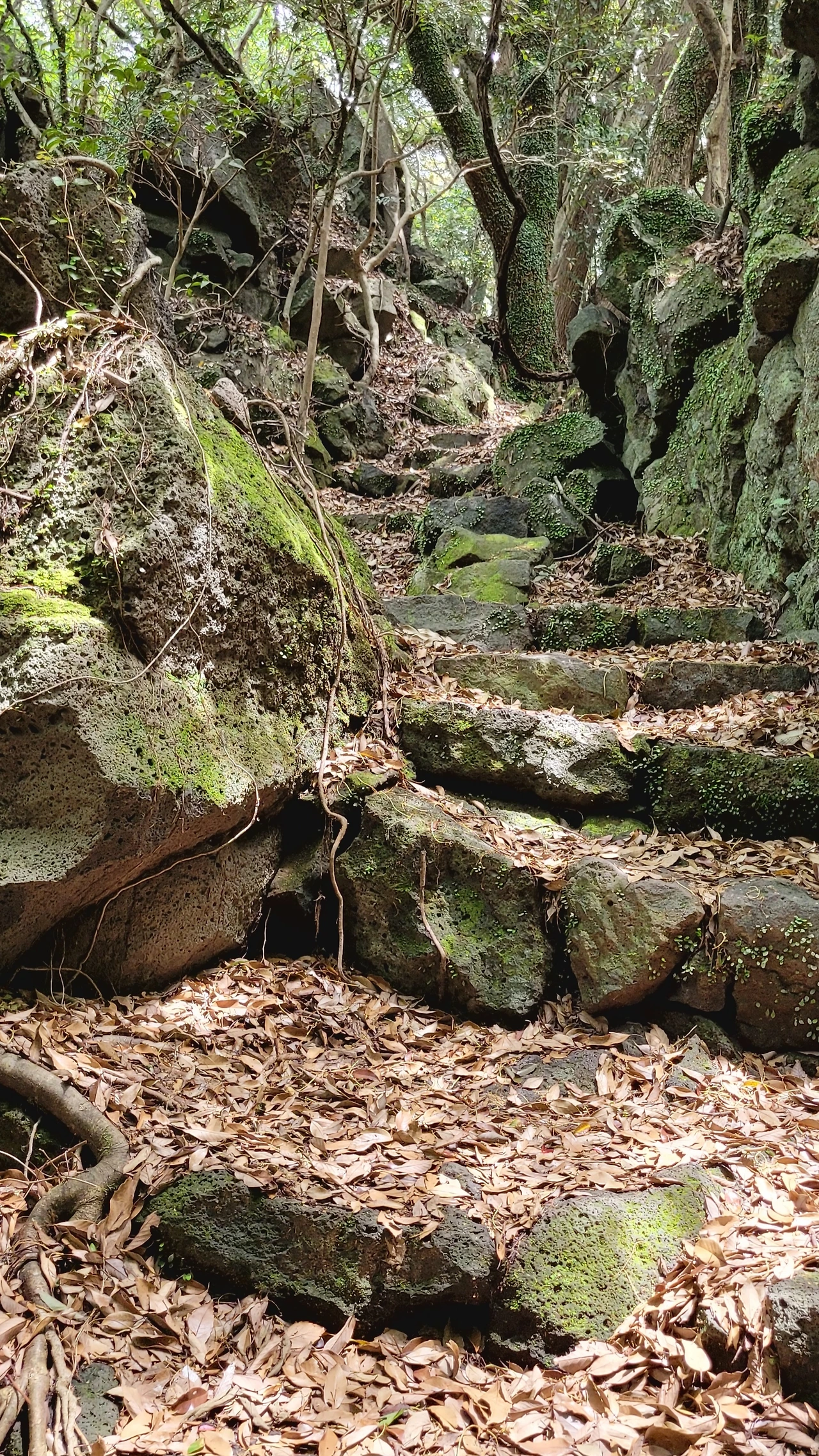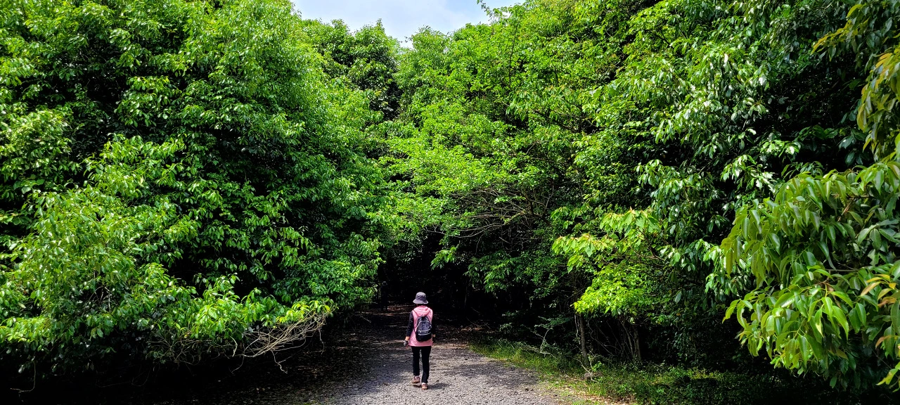 "선흘 곶자왈입니다. 화산 폭발로 흘러내린 용암이 지표를 덮은 대지 위에 습지와 용암 언덕들이 생깁니다. 그 깨진 돌무더기 틈 사이로 땅속 깊이 빗물이 스며들지요. 다시 그곳으로부터 수증기가 뿜어져 나와 온도와 습도를 일정하게 유지합니다. 양치류가 풍성하며, 난대성 상록수가 울창한 숲을 이루지요. 동백나무, 개가시나무, 종가시나무, 구실잣밤나무, 황칠나무 등과 같은 키가 훤칠하게큰 나무를 볼 수 있습니다."