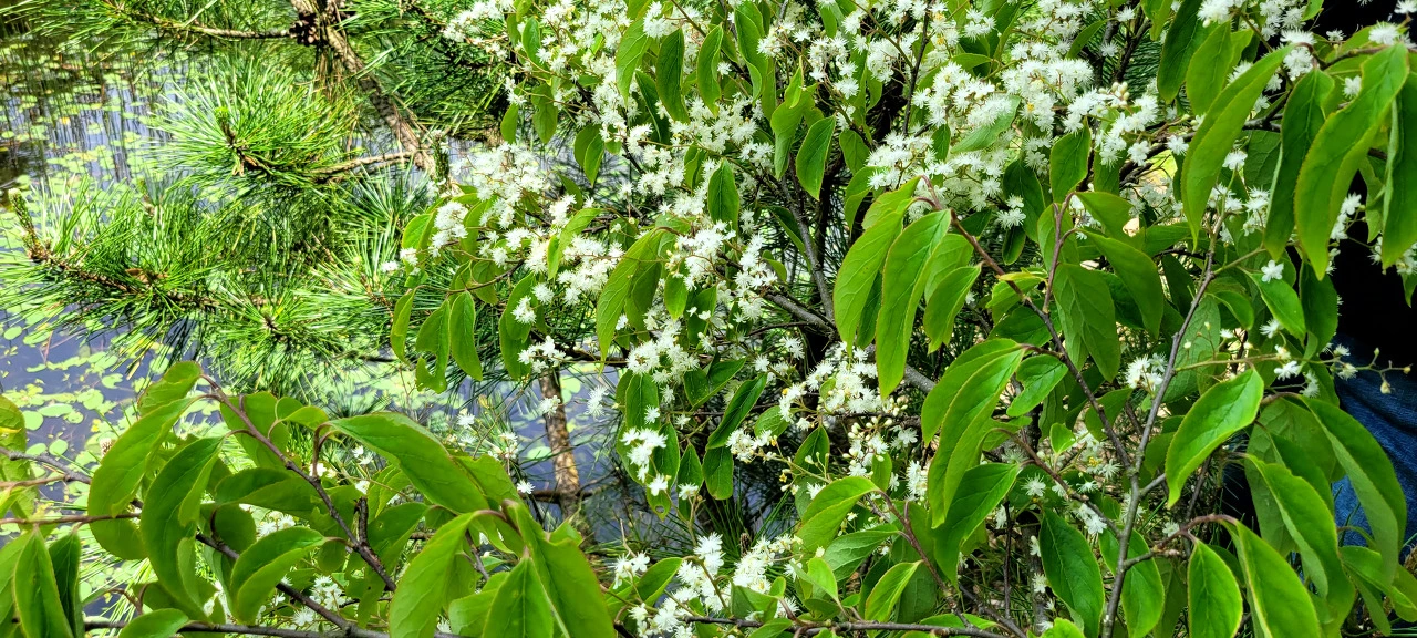 노린재나무. 습지 가장자리에 단풍이 든 잎을 태우면 노란색 재를 남긴다는 노린재나무가 흰 꽃을 소복이 달고 있다. 눈 덮인 듯한 모양이다. 태운 재를 매염제로 사용한다.