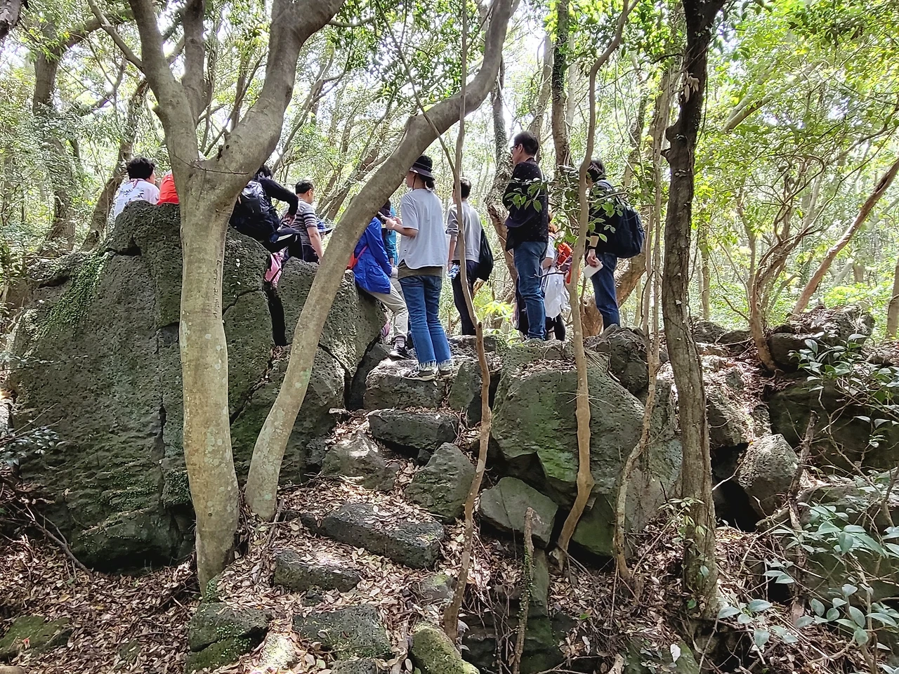 "종가시나무인데 죽어가는 것 같지만 살아 있어요. 뿌리가 다 드러나서도 살아갑니다. 뿌리 밑에 용암대지가 있어 뿌리가 깊이 박지 못하고 옆으로 뻗다가 바람에 넘어진 것입니다. 그리고 뿌리가 위로 올라온 나무도 보이지요"