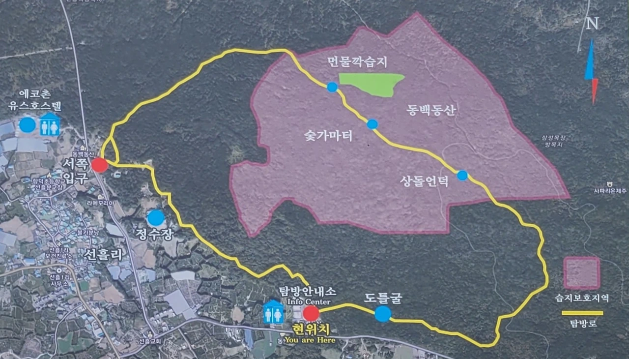 다시 원점으로 돌아온다. 출발점에서 조금 떨어진 삼거리를 만난다. 2번 지점이 52번 지점과 동일하다. 동백습지센터로 돌아나와 일정을 마친다. (2023. 5. 17)