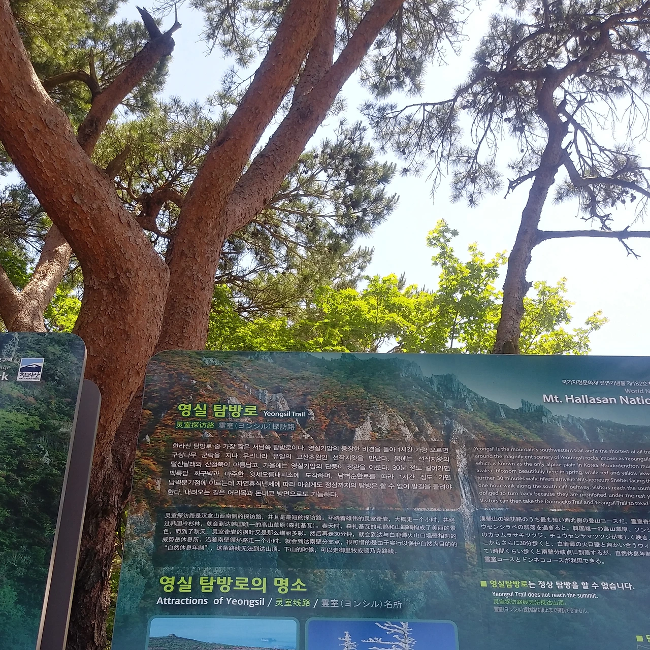 탐방로는 입구부터 제주도에서 흔히 볼 수 있는 곰솔과는 다른 모습을 한 붉은 소나무 숲이 펼쳐진다. 나무껍질이 얇고 붉은빛을 띠고 있다. 겨울눈 또한 붉은색을 띠며 해발 900~1,300m의 지점에서 자란다. 솔바람 소리가 상쾌하다.