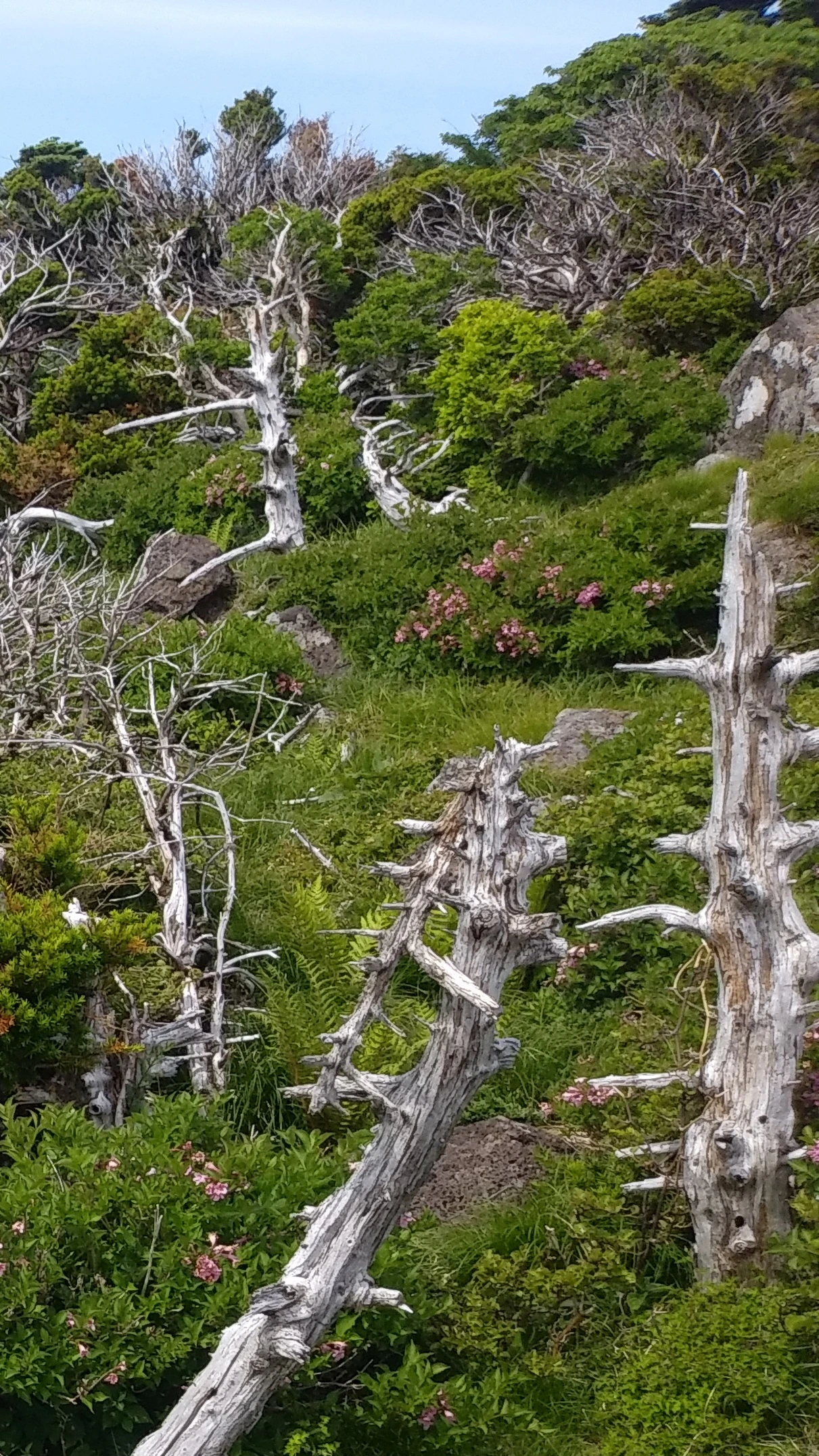구상나무는 원래부터 따뜻한 곳을 싫어한다. 지구 온난화로 생육고도가 높아져 서식지와 개체수가 급감하고 있다. 이제는 산 꼭대기까지 올라와 더 물러날 곳이 없다. 안타깝게도 멸종위기 식물의 반열에 올랐다. 대부분의 고사목은 구상나무가 남긴 것이다.