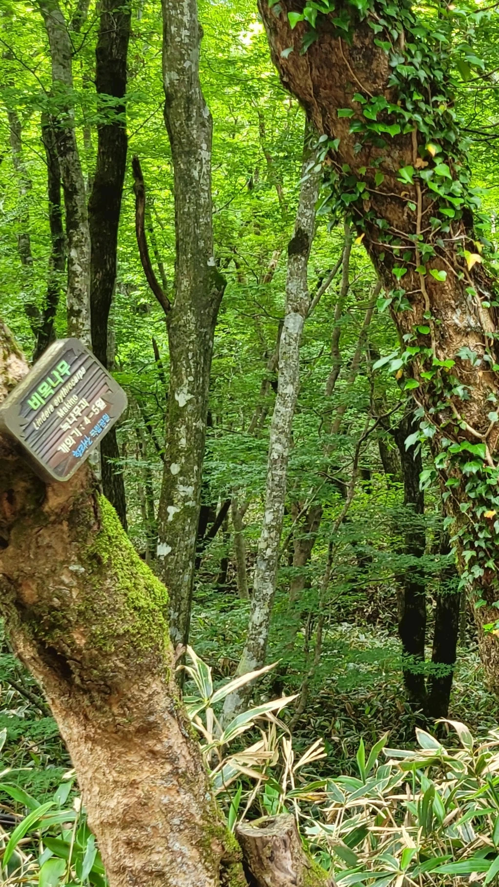 영실매표소에서 영실휴게소까지 2.5km의 진입로는 차가 오르내린다. 출입할 수 있는 차량수를 통제하고 있어 통행량은 많지 않다. 덕분에 맑은 공기를 마음껏 마실 수 있다. 들머리부터 온통 짙은 녹음이 우거져 숲 속이 컴컴하다. 팥배나무를 노박덩굴이, 비목나무에 담쟁이덩굴이 타고 오른다. 때죽나무의 흰꽃이 떨어져 보도를 덮고 있다. 졸참나무, 단풍나무, 굴거리나무, 산수국 그리고 땅바닥을 기는 조릿대 등이 조화를 이루며 살아간다.