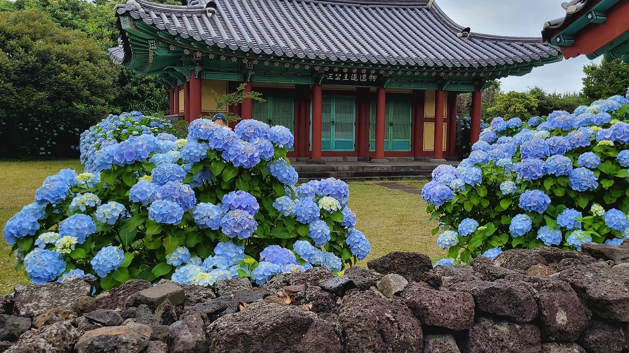 예식장이었던 연못가를 한 바퀴 돌고, 세 신혼부부의 신방이었던 신방굴, 벽랑국(碧浪國) 삼 공주(三公主)의 위패를 봉안한 삼 공주 추원사, 전통 혼례관으로 이어지는 혼인지 일대는 탐방로를 따라 수국이 활짝 피었다.
