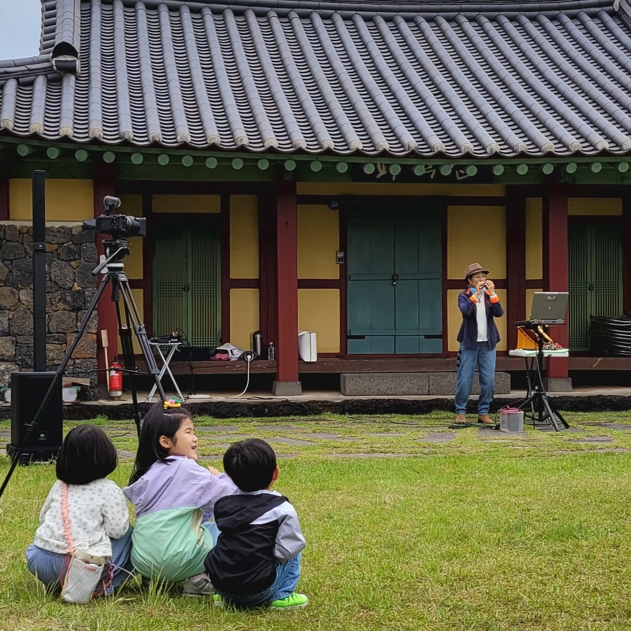 전통 혼례관 앞 잔디밭에서 공연을 하고 있다. 어른들은 모두 수국에 관심을 보이고 있고, 관중은 달랑 아이들 세 명뿐이지만 하모니카 연주자에서 오카리나 연주자로 공연은 계속된다.