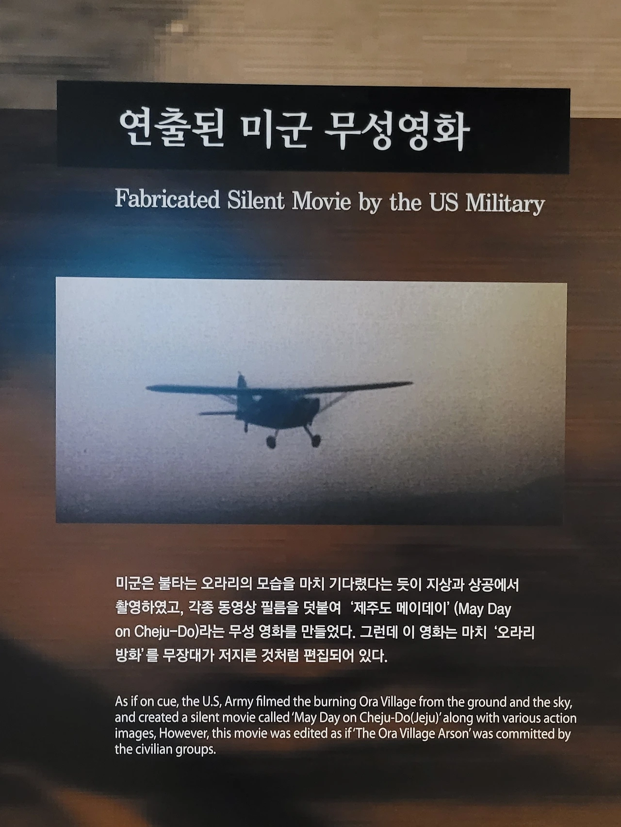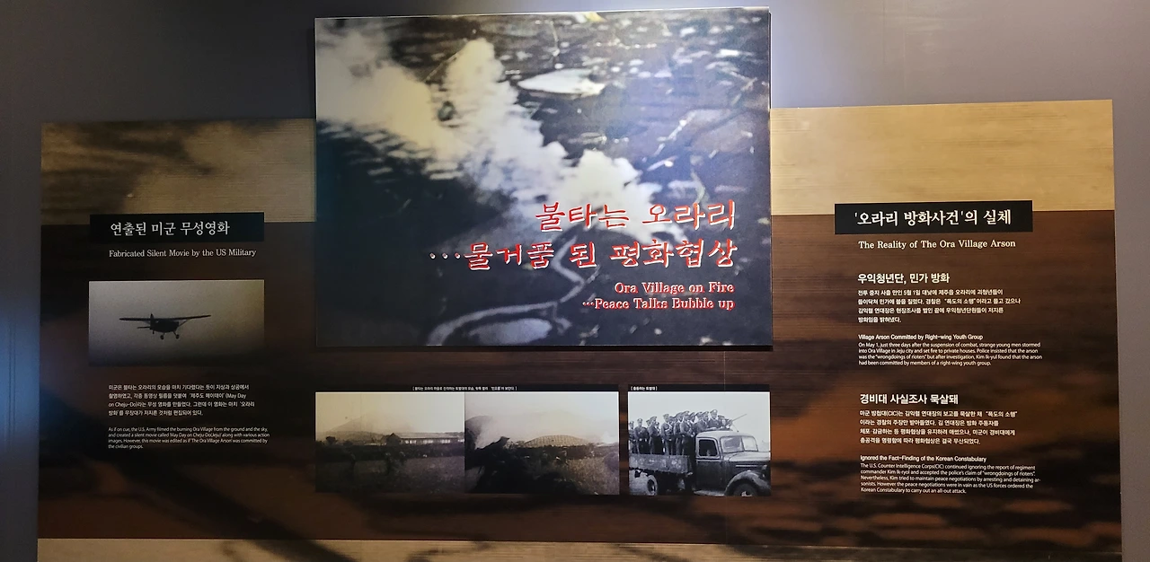 미군 방첩대(CIC)는 김익렬 연대장의 보고를 묵살합니다. 뿐만 아니라 미군은 '제주도 메이데이'라는 무성영화를 만들어 마치 '오라리 방화 사건'을 무장대가 저지른 것처럼 여론몰이에 나섭니다.