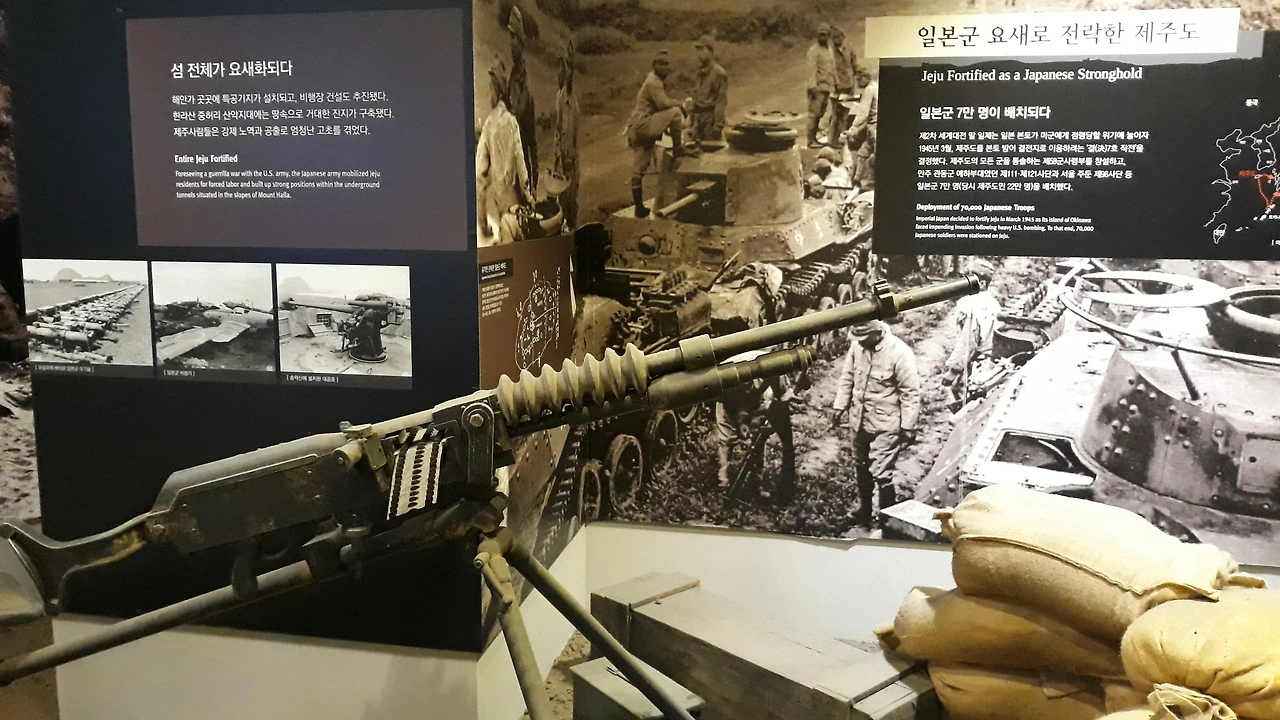 일제는 2차 대전 말 일본 본토가 미군에게 점령될 위기에 처하자 제주도를 본토방어 결전지로 삼는데요. 해안가 곳곳에 진지를 구축하고, 비행장도 건설합니다. 섬 전체가 일본군 요새로 전락하고 일본군 7만 명이 배치됩니다. 제주 사람들은 강제 노역과 공출로 엄청난 고초를 겪게 되지요.