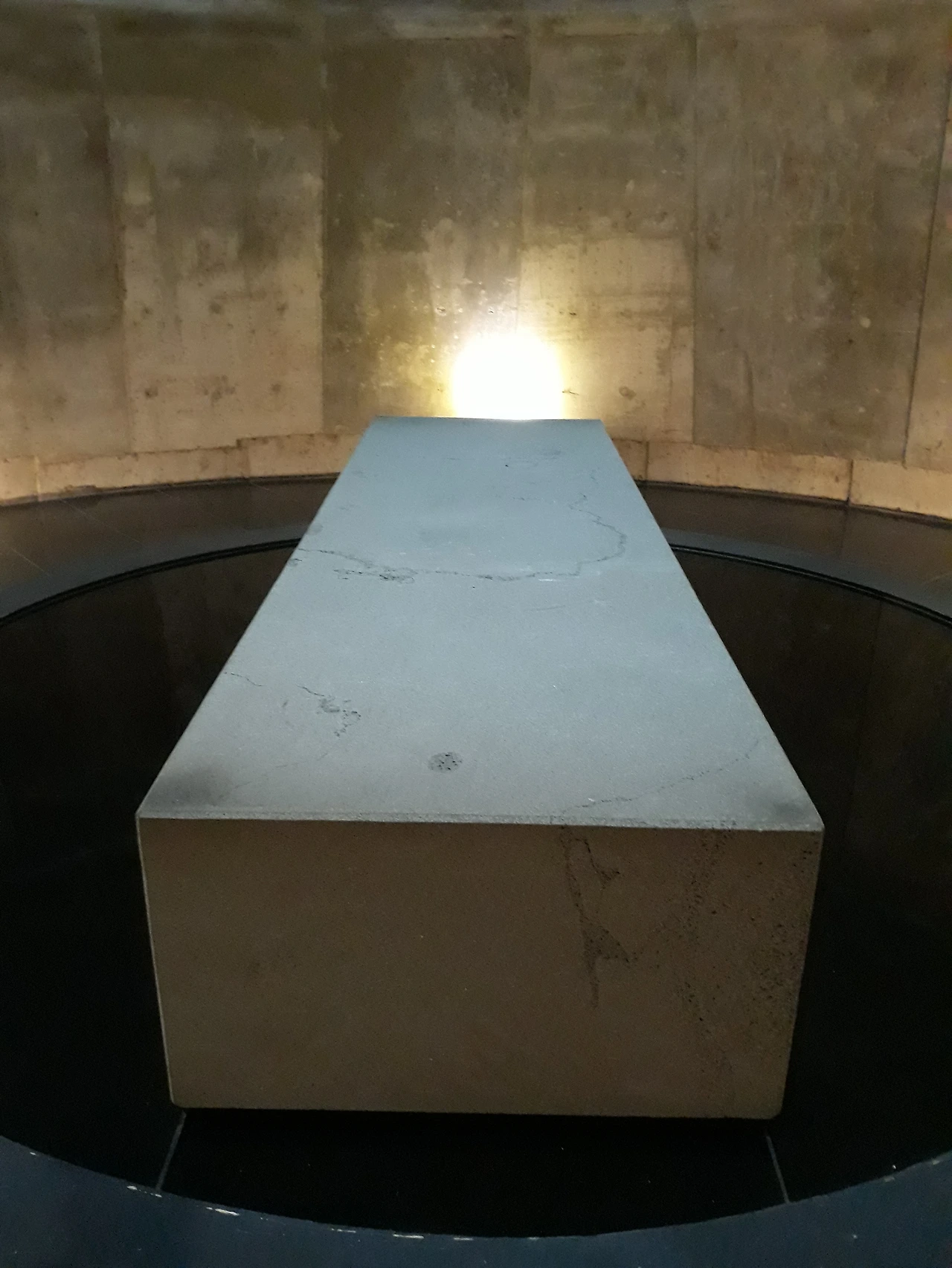 어두운 동굴에 하늘에서 빛이 쏟아져 내리고 그곳에 백비가 누워있습니다.