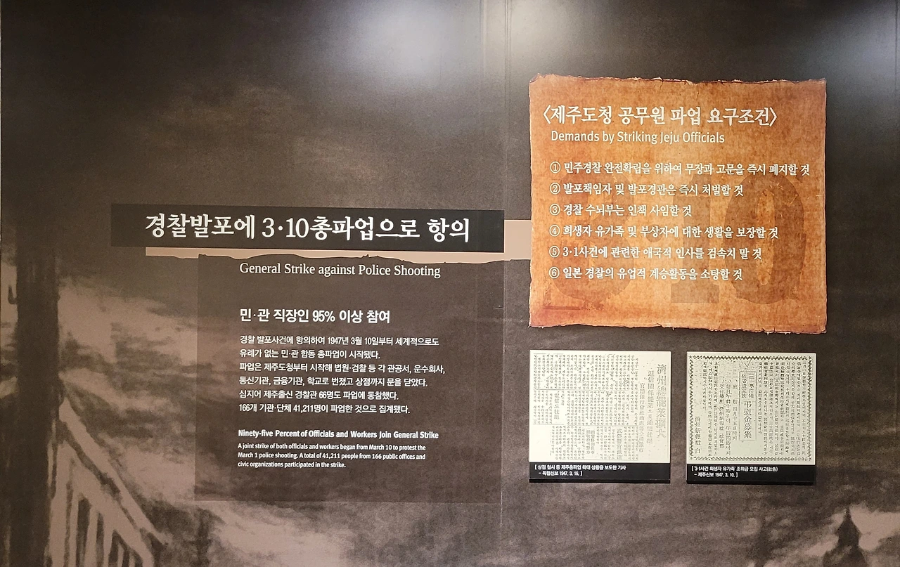 경찰 발포에 제주도민은 민ㆍ관 합동 3.10 총파업으로 항의하기에 이르고, 심지어 경찰관 66명도 파업에 동참합니다. 제주도청 공무원들도 "발포 책임자 및 발포 경관 처벌, 3.1 사건에 관련한 애국적 인사를 검속 하지 말 것, 경찰의 무장과 고문 즉시 폐지, 희생자 유가족 및 부상자에 대한 생활 보장' 등 6개 항의 요구조건을 내걸고 파업을 합니다.