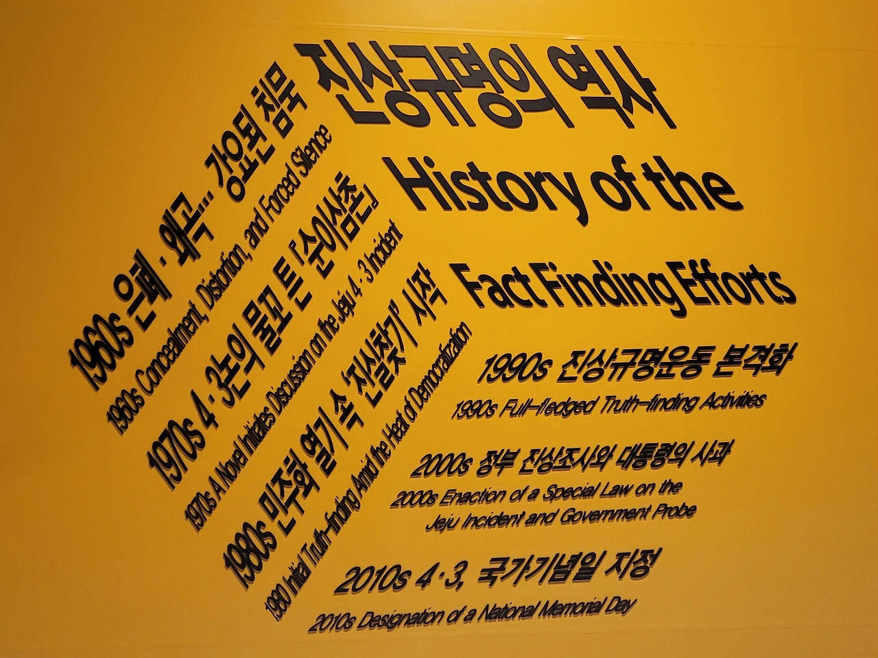 김 선생 이제 4.3 평화 기념관의 마지막 전시실로 옮겨갑니다. 이 모든 일이 이 땅에 함께 사는 사람들을 같은 인간으로 대우하지 않는 엘리트 세력의 오만과 탐욕에서 일어났다고 하기에는 그 후유증이 너무 컸습니다.