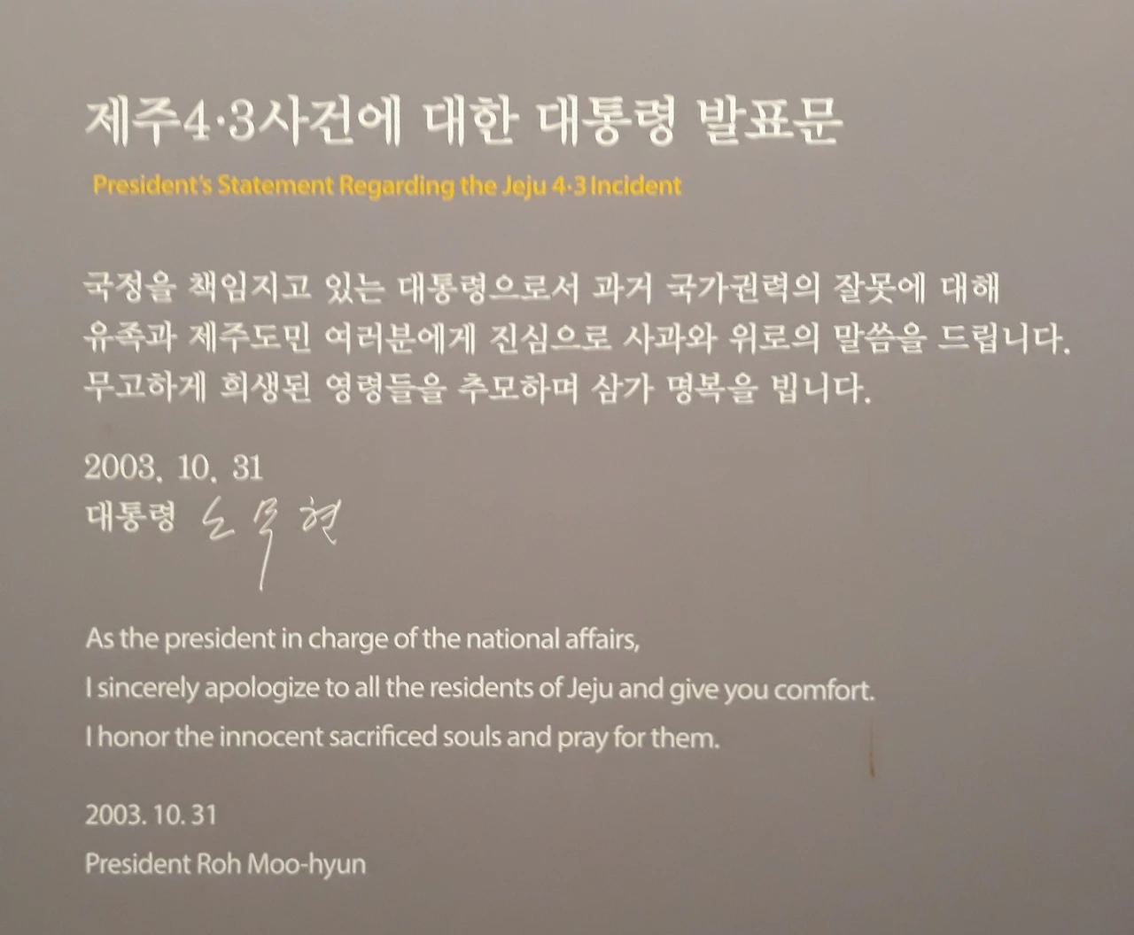 2003년 10월 15일 국가 공권력의 인권유린'으로 규정한 진상조사보고서가 확정됐고, 노무현 대통령은 과거 국가권력의 잘못에 대해 유족과 제주도민에게 사과하고 무고하게 희생된 영령들을 추모합니다. 국가 차원의 첫 사과입니다.