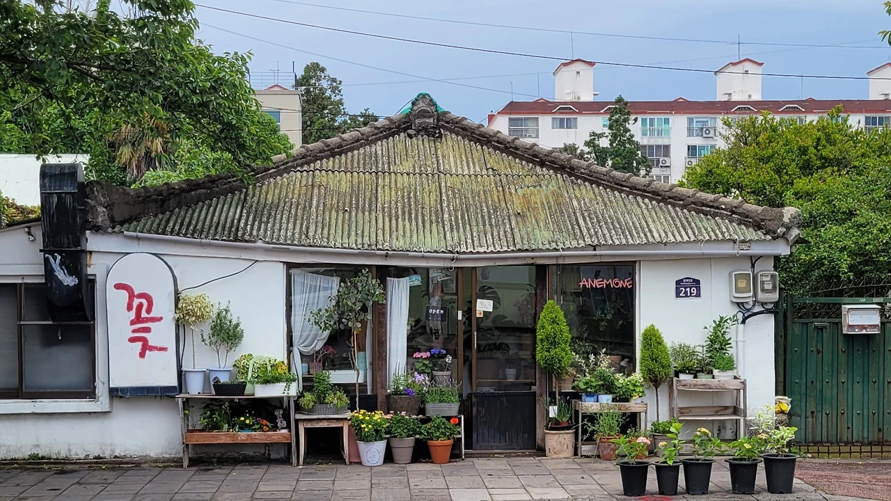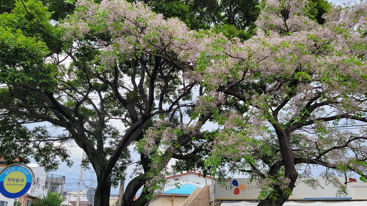 길가에 화분을 내어 놓은 꽃집이 서정적인 멋을 부린다. 뭉게구름처럼 피어난 멀구슬나무의 연분홍 꽃은 거리를 화사하게 꾸민다. 4·3의 아픔을 애써 잊고 사는 듯 하지만 '육지 것들'이란 말로 속내를 은근히 내보인다. (2023. 5. 15)