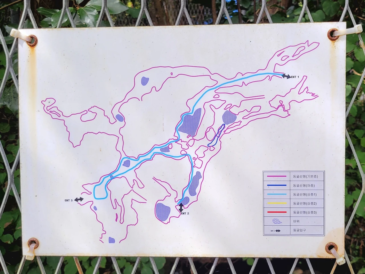 "벵뒤굴(천연기념물 제490호)은 다층구조가 발달된 약 4.5km의 복잡한 미로형 동굴입니다. 작은 동굴들이 거미줄처럼 여러 갈래로 엃혀 있지요. 파란 라인이 동굴 속 길입니다. 우리는 2 입구에서 들어가서 3 입구로 갔다가 다시 되돌아서 1 입구로 나옵니다. 서서 걸을 수 있는 공간은 거의 없다고 보면 됩니다."