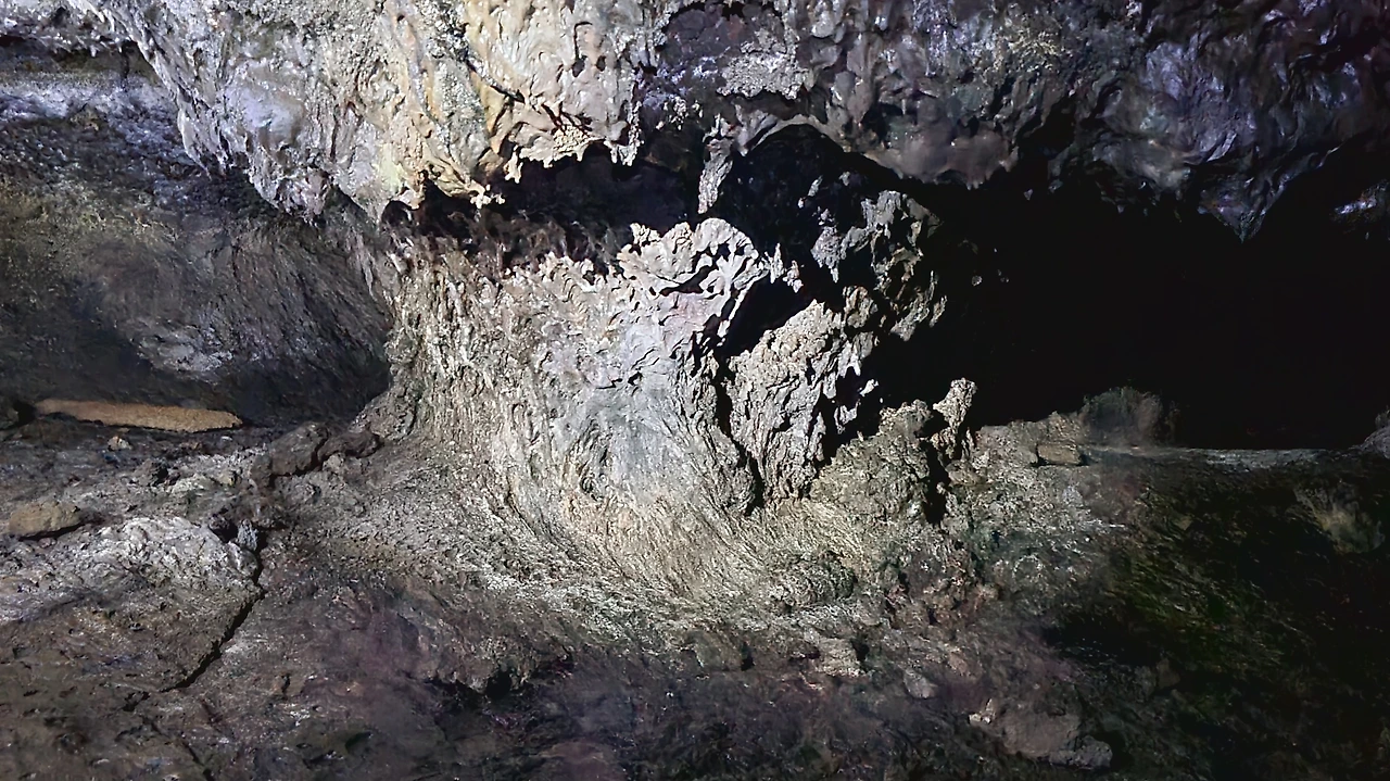 용암석순과 용암석주. 녹아내린 용암이 바닥으로 떨어져 촛불의 촛농처럼 바닥에 쌓인 것을 용암석순이라 한다. 언젠가 종유석과 석순이 만나면 돌기둥이 된다. 이처럼 용암이 떨어지면서 만든 기둥을 용암석주라고 한다.