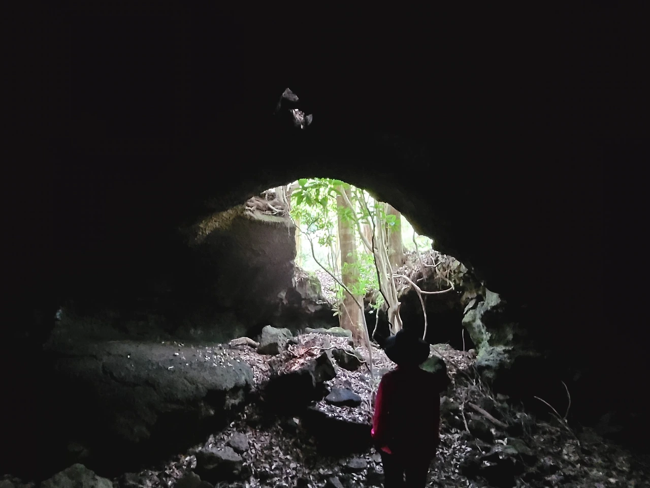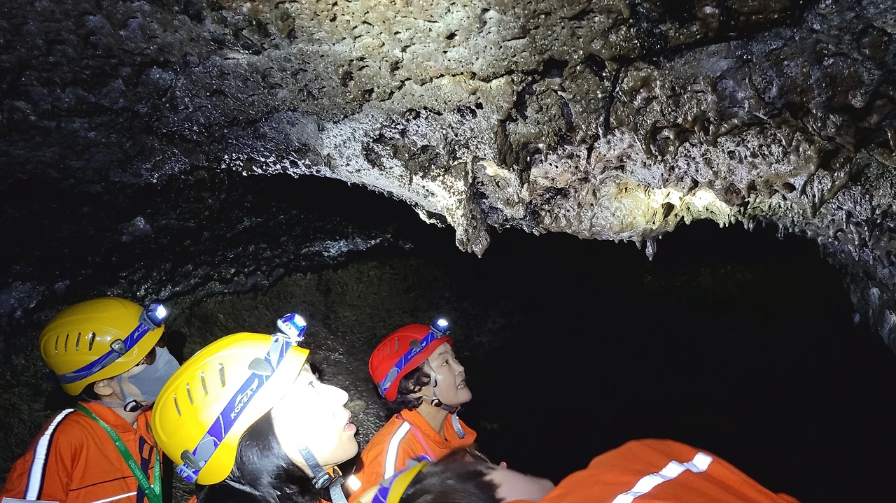 "이제 굴 안으로 들어갑니다. 랜턴 불 켜세요. 장갑도 끼세요. 바닥을 잘 보시고요. 머리 조심하세요.용암 다칩니다. 하하. 천천히 들어오세요."
