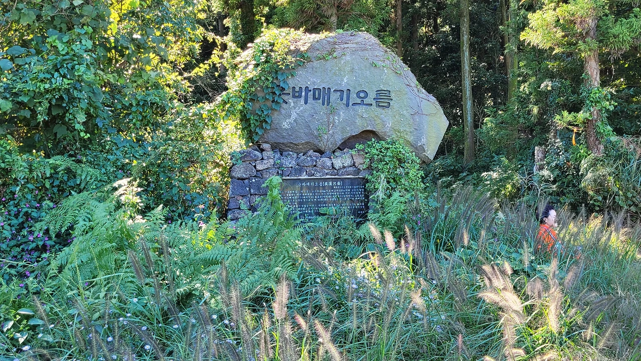 웃바매기오름 입구에 셔틀버스가 기다린다. 물봉선, 쑥부쟁이가 벵뒤굴 특별탐험대의 무사귀환을 환영한다. 알밤오름이 뒤에서 내려다보고 있다. 세계자연유산마을보존회에서 "제주 화산섬과 용암동굴에서 위대한 자연의 숨결을 함께하며 그 소중한 가치를 느끼고 향유하기 위해 세계자연유산 특별탐험대의 대원으로 활동하였음"을 인증하는 증서를 받는다. (2023. 10. 4)